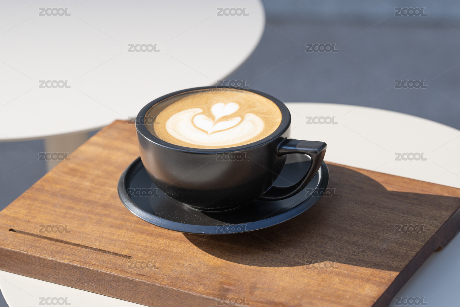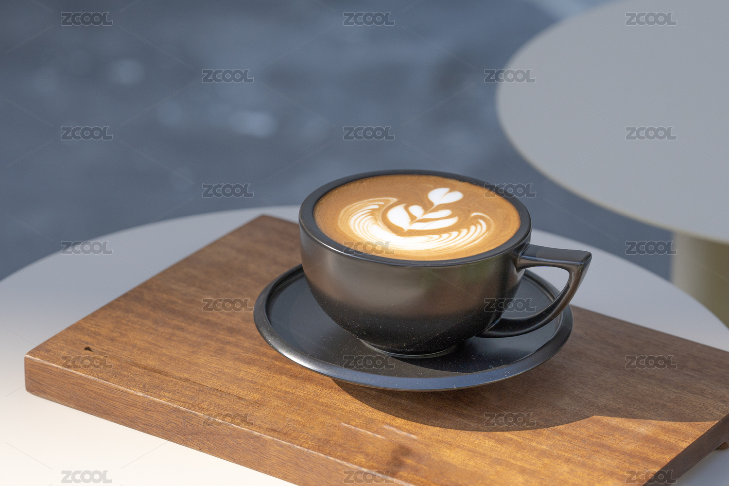 木制桌面上的咖啡拿铁压纹拉花的特写