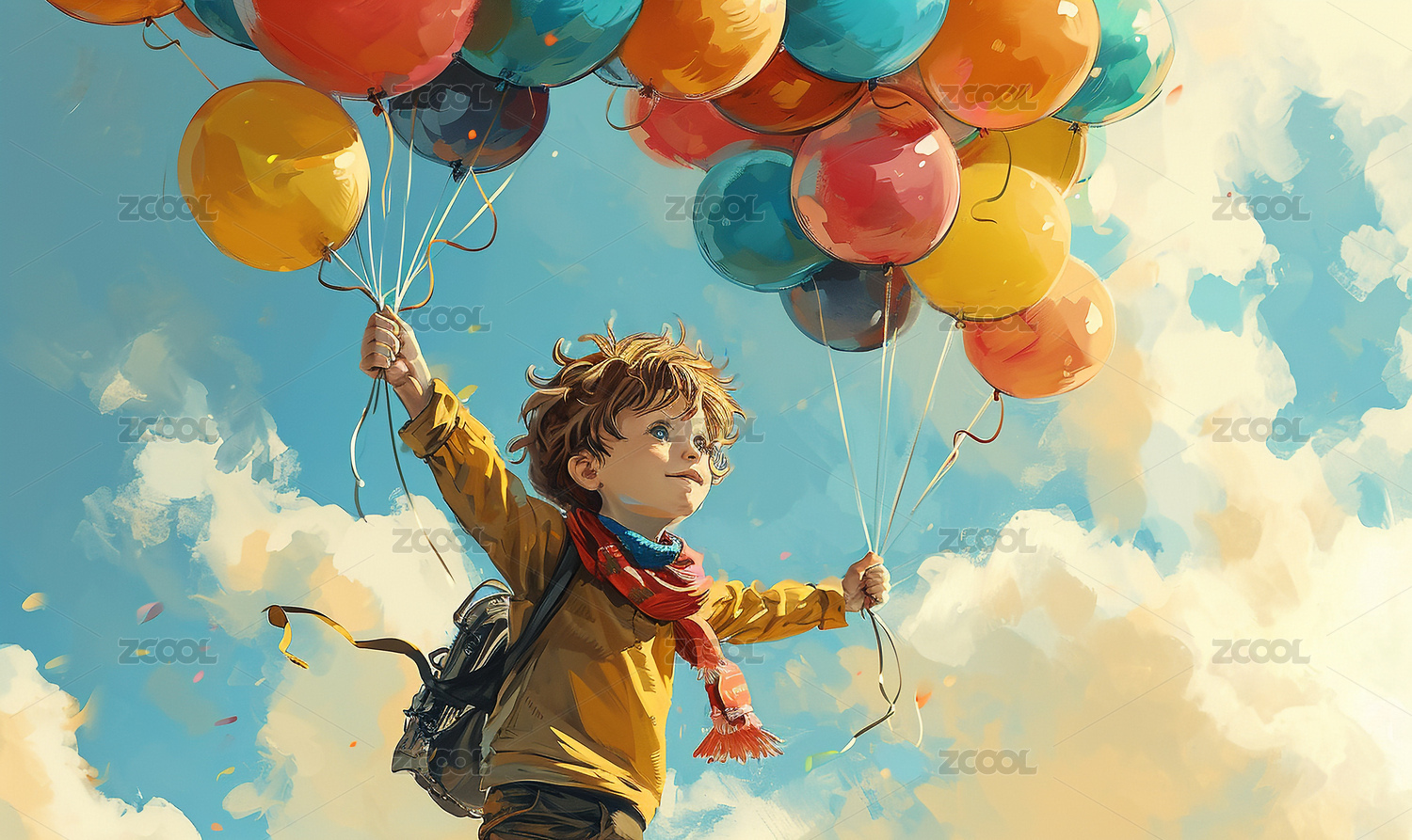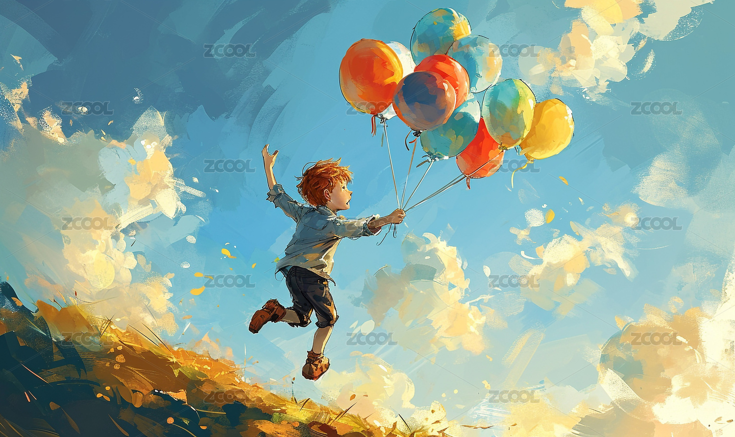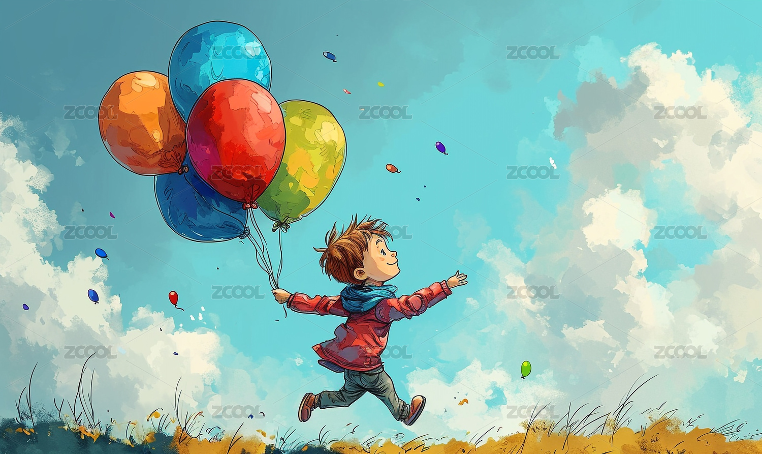 卡通可爱奔跑的男孩天空气球梦幻治愈插画