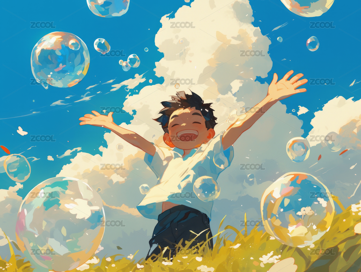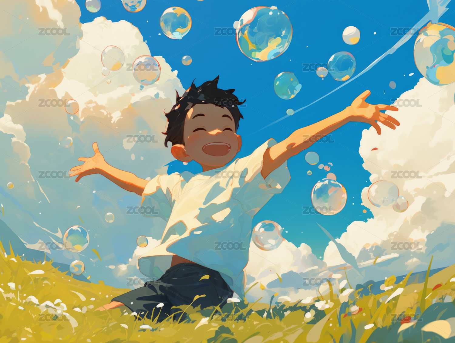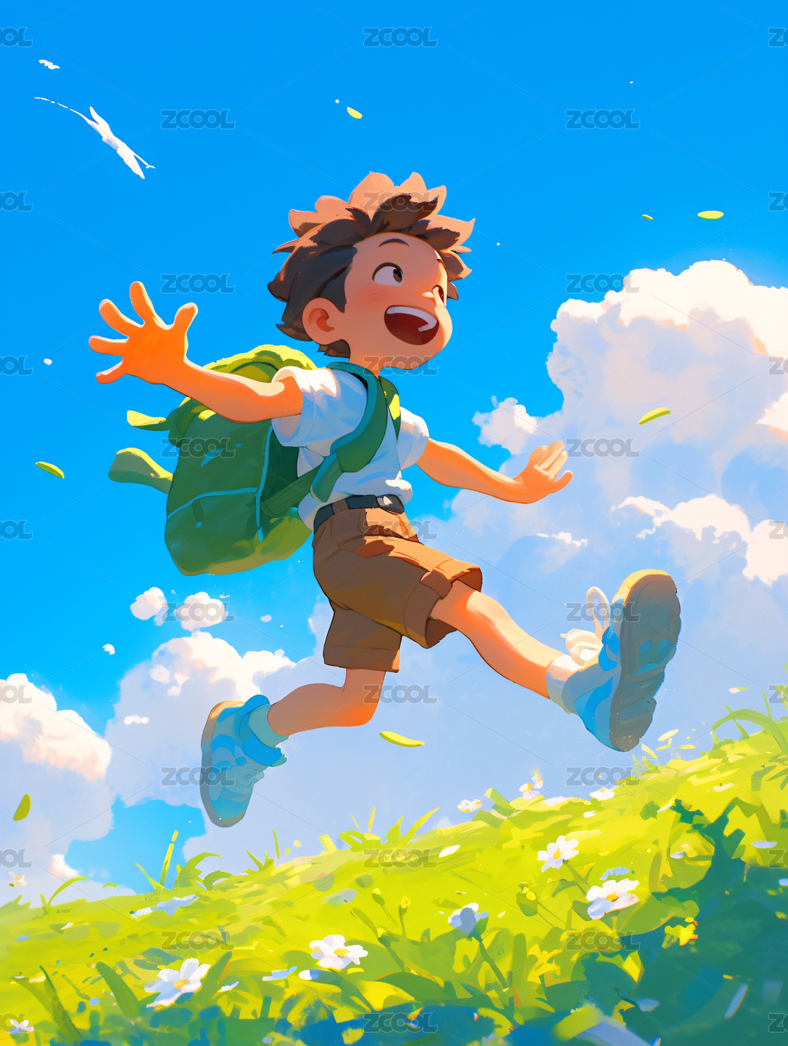 卡通可爱奔跑的男孩天空气球梦幻治愈插画