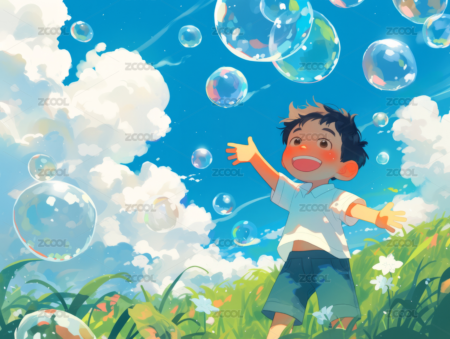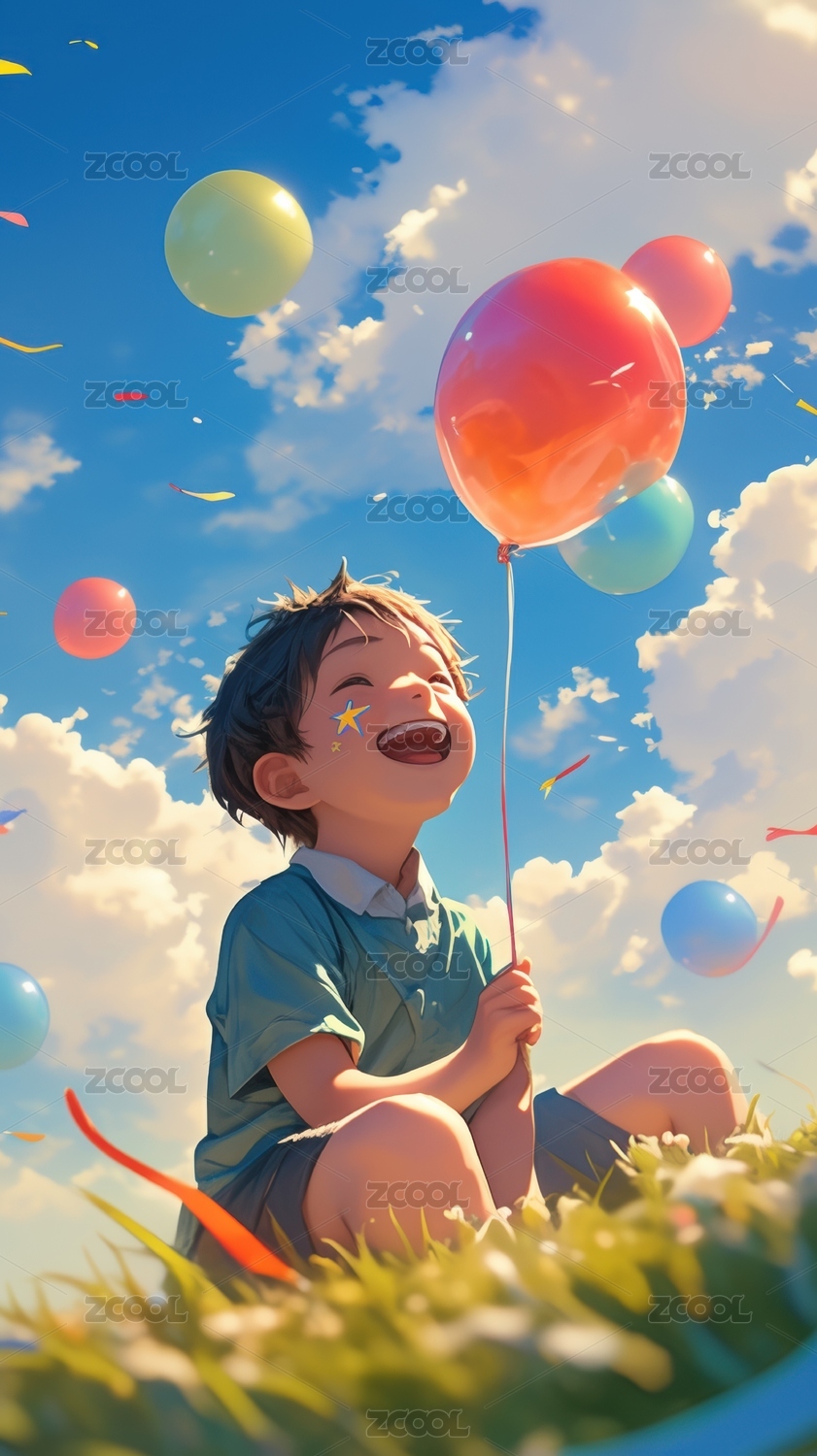男孩,儿童,儿童节,气球,蓝天,白云,蓝色,彩色,白色,开心