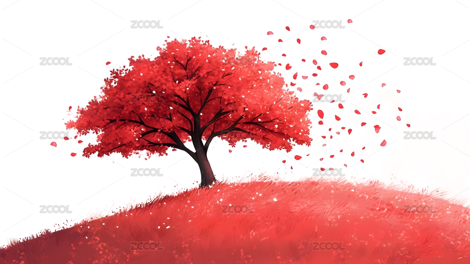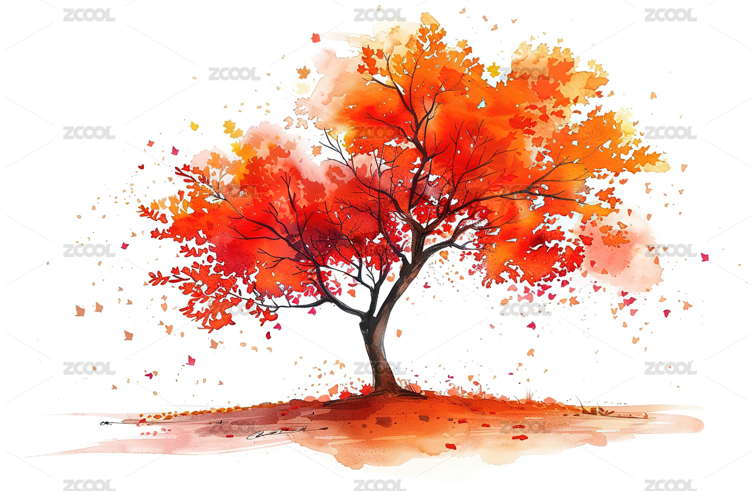 红叶飘落秋日树林
