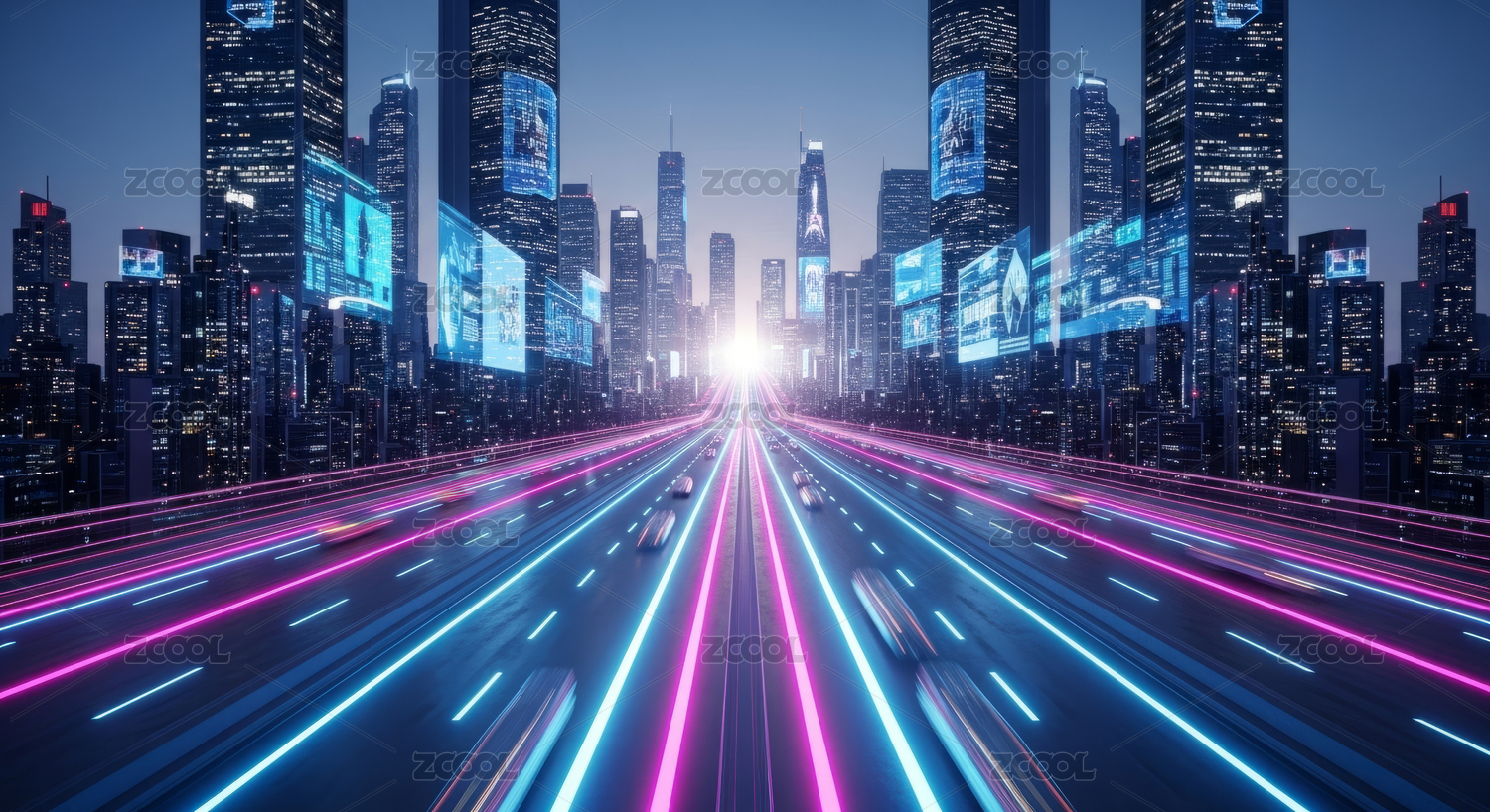 赛博朋克风格城市地平线及速度感公路