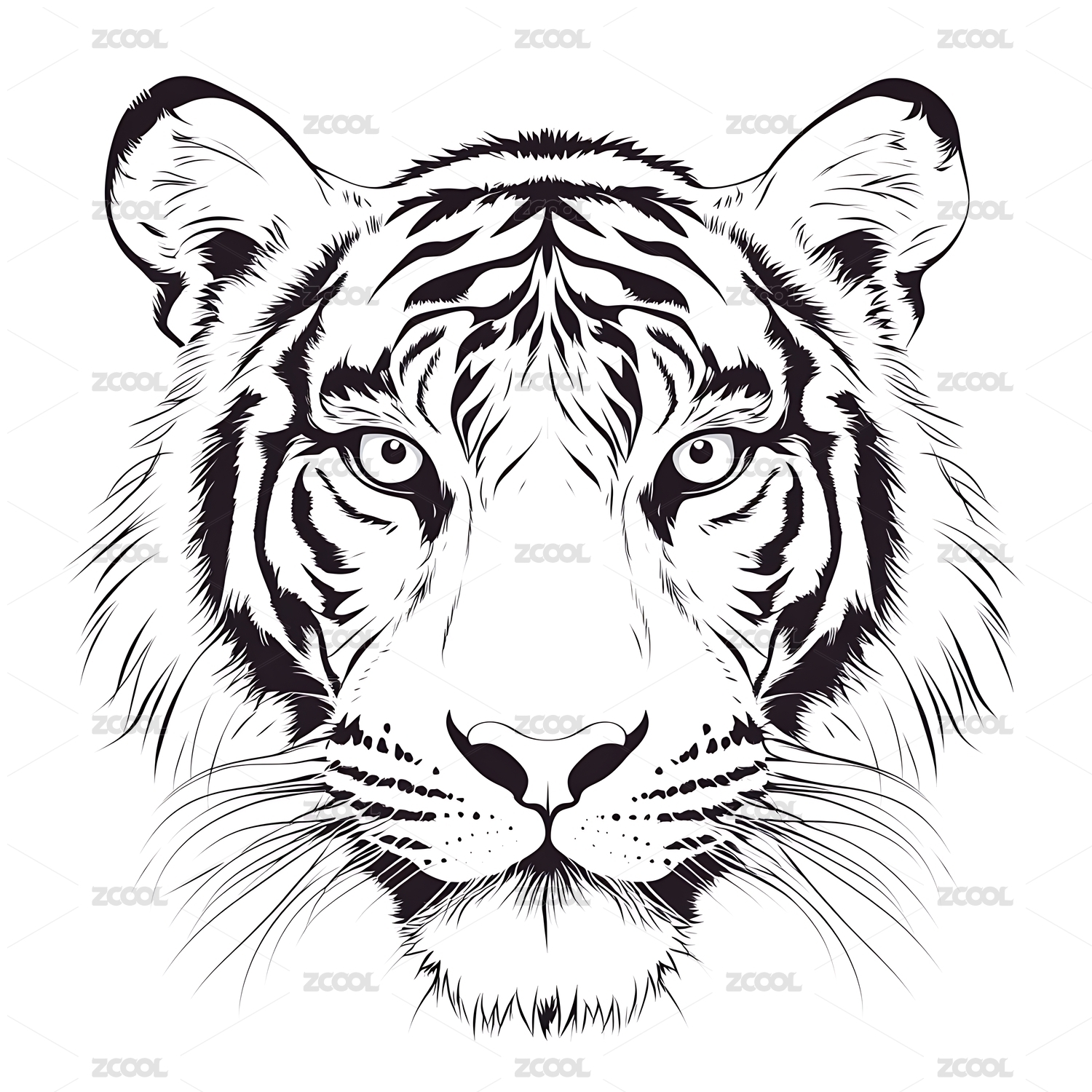 黑白线条风格的老虎头部特写