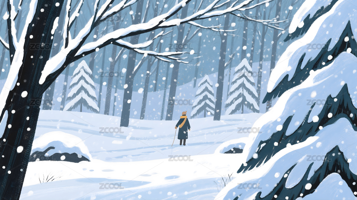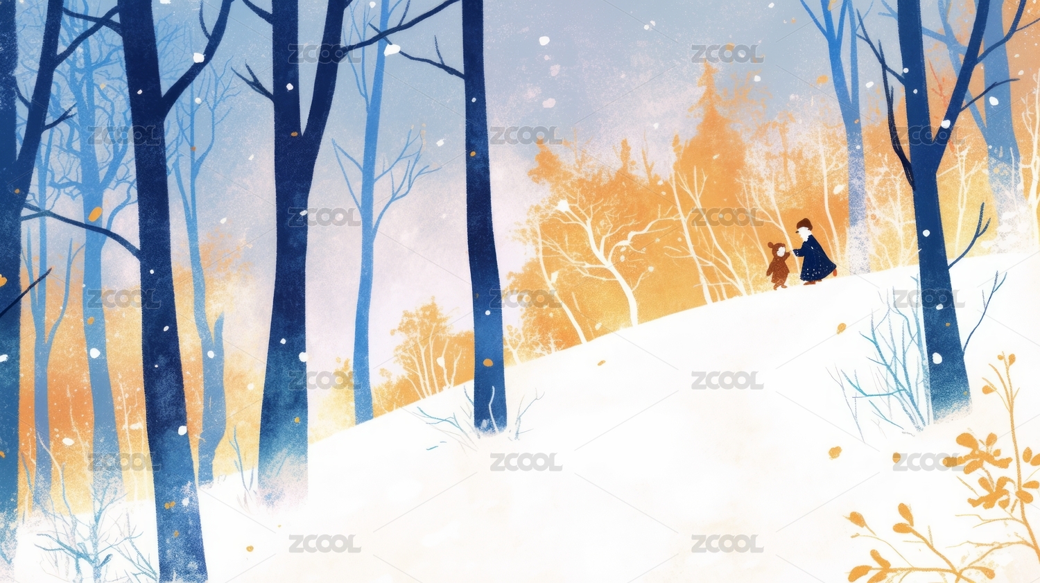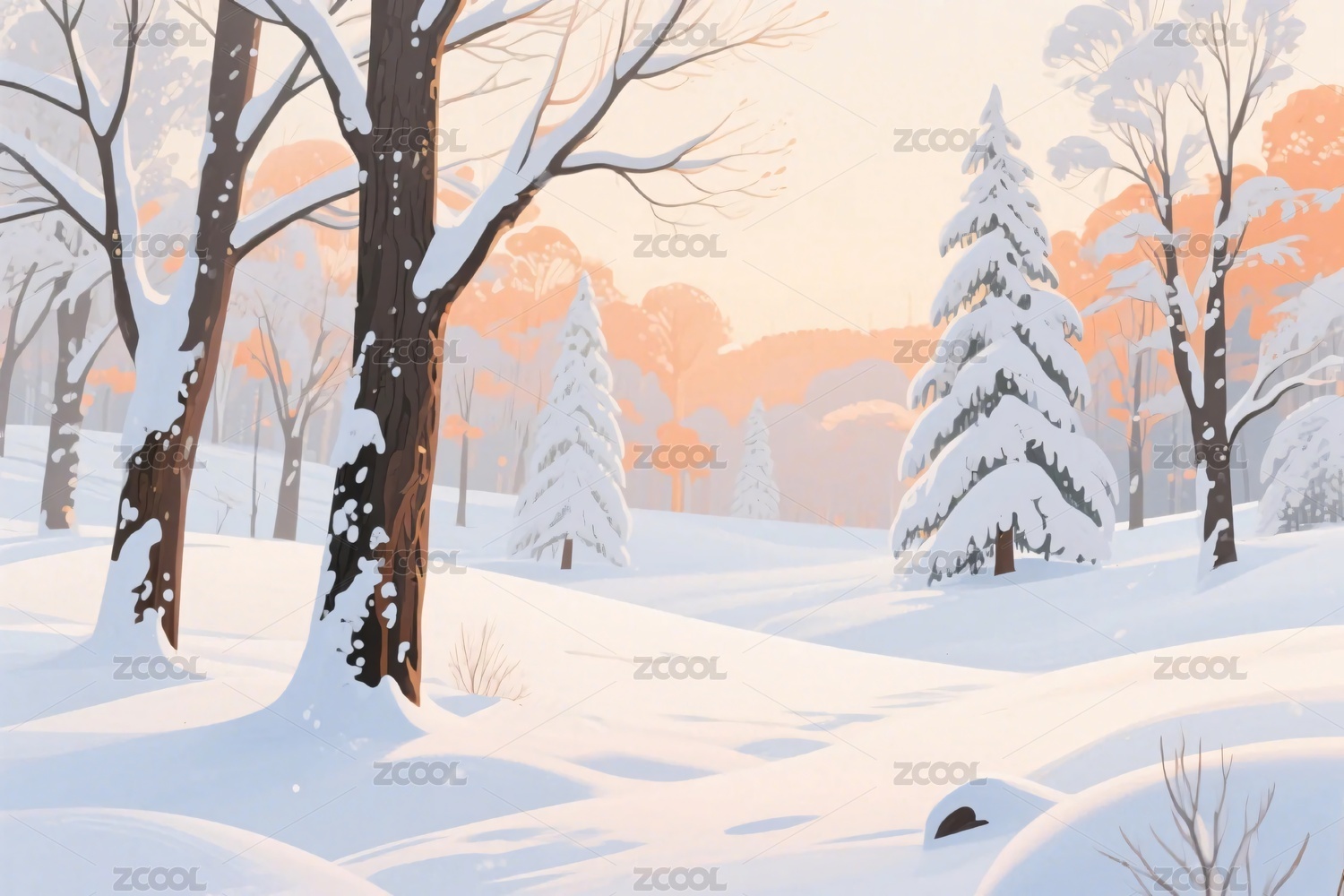 清新明亮冬天有厚厚的积雪的树林插画绘画