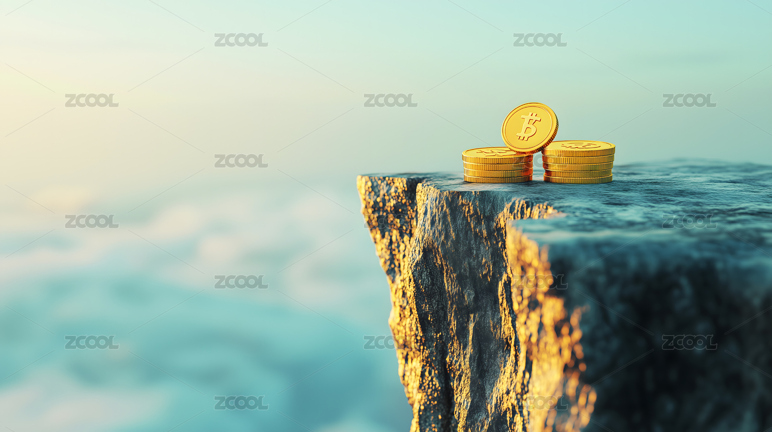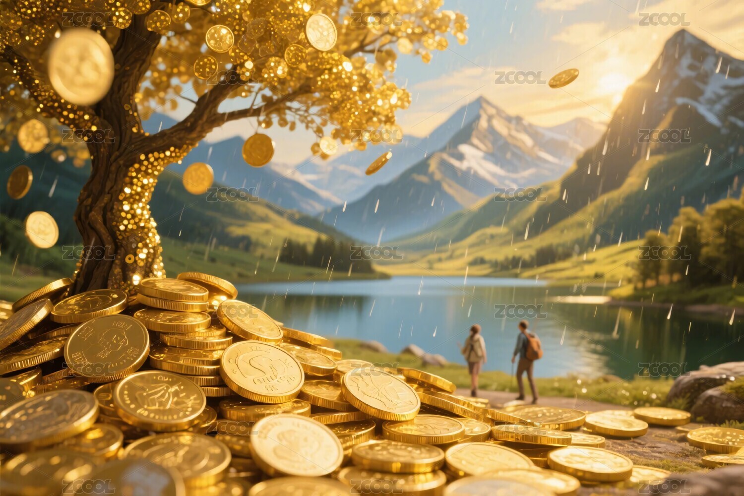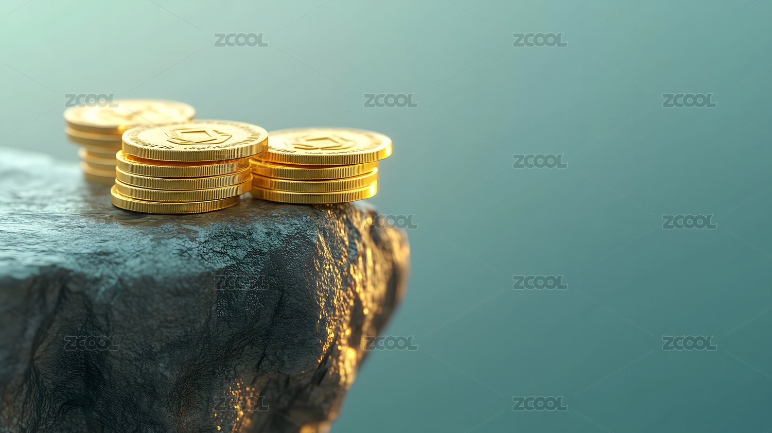 一堆金色的硬币和胶卷背景是模糊的金色光斑