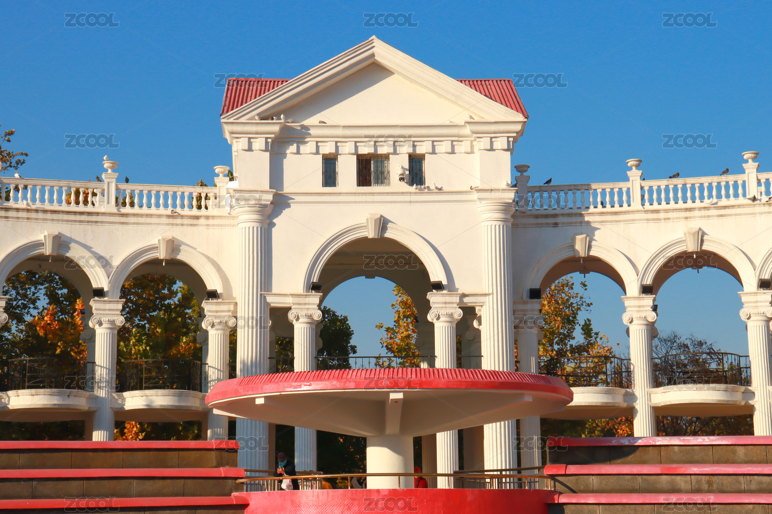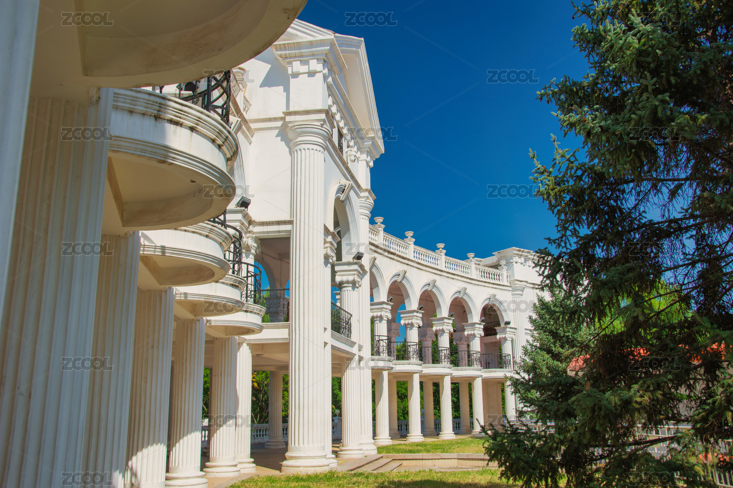 蓝天白云下的欧式白色建筑物回廊
