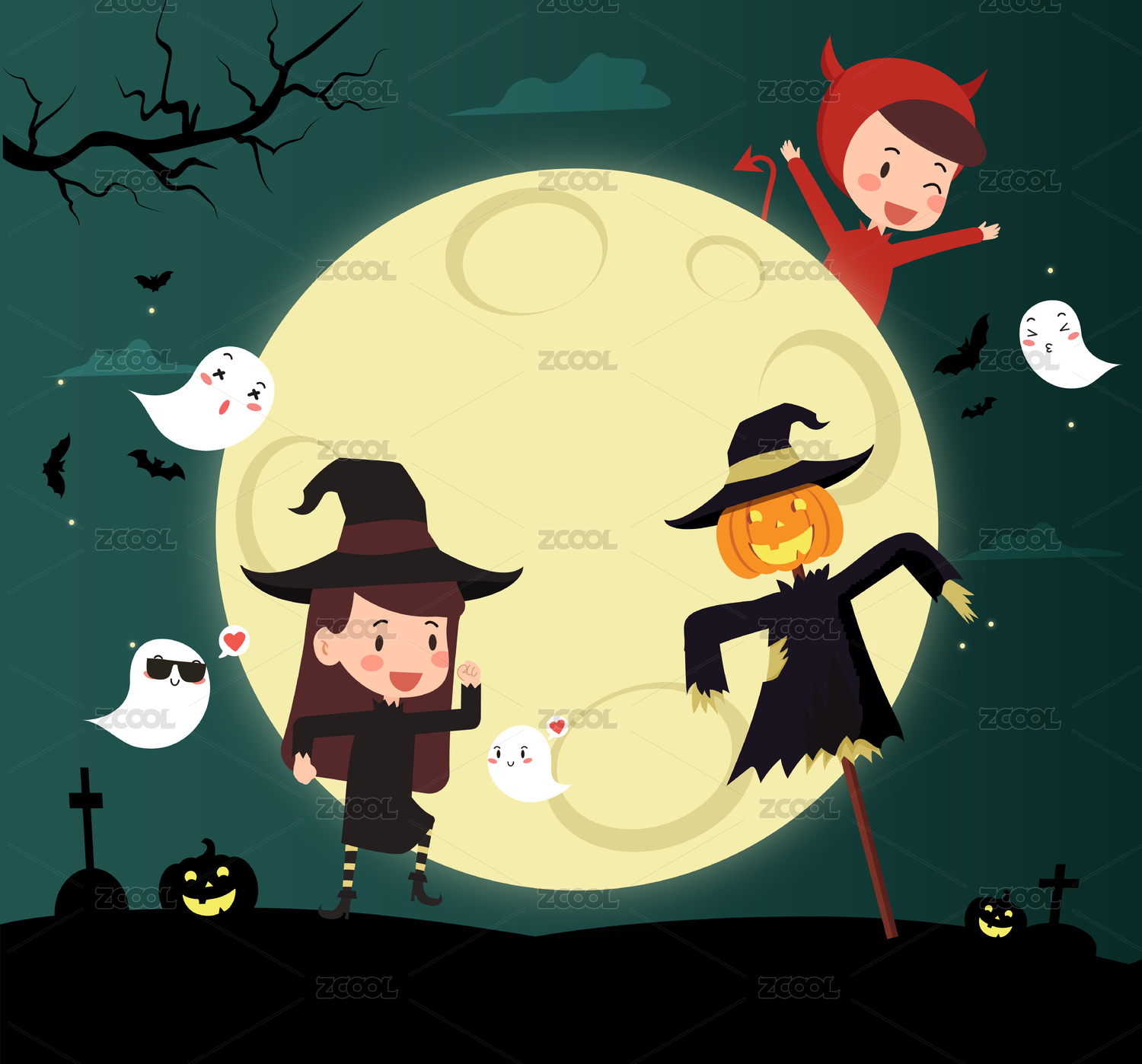 万圣节女巫秋天节气夜晚节日场景卡通插画