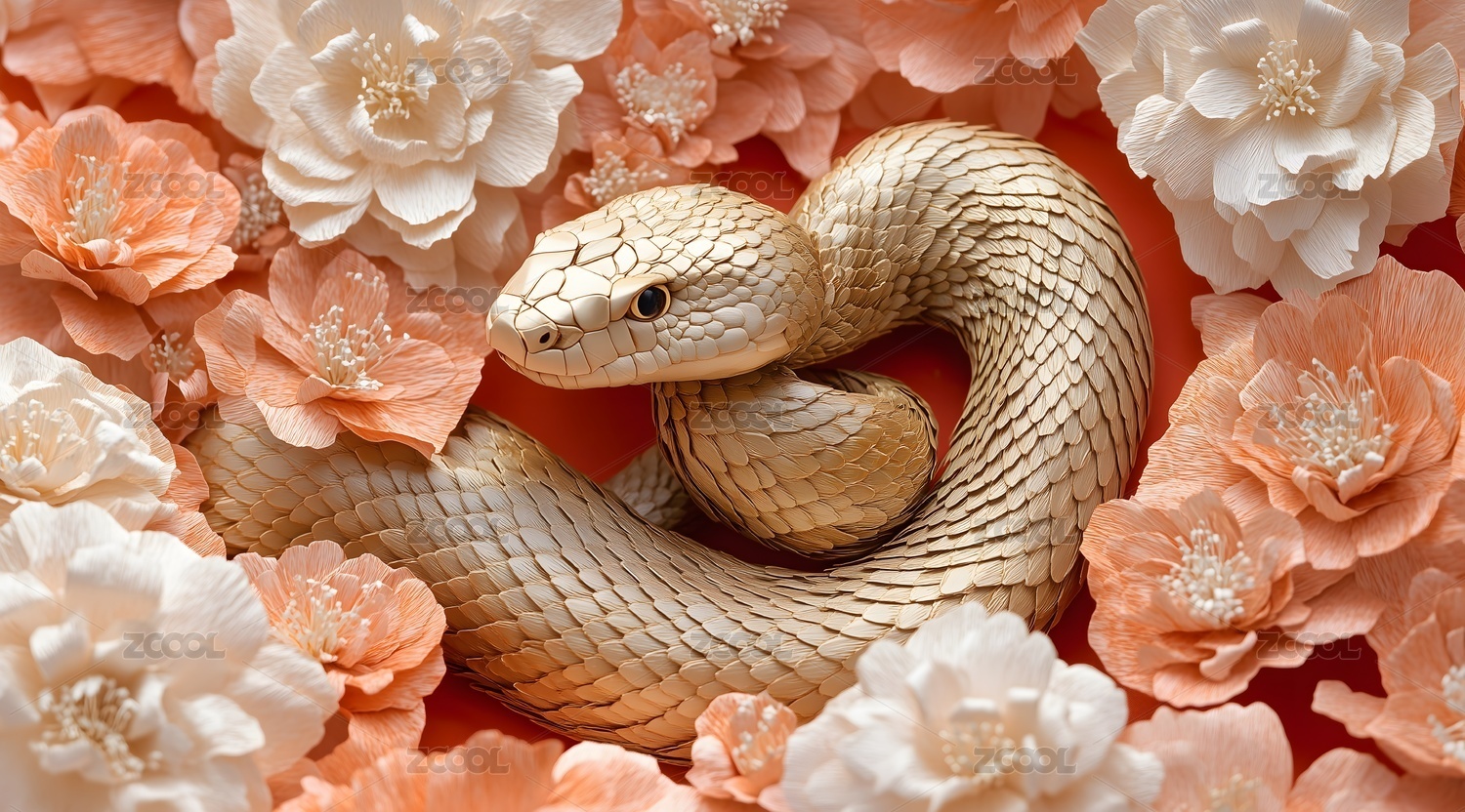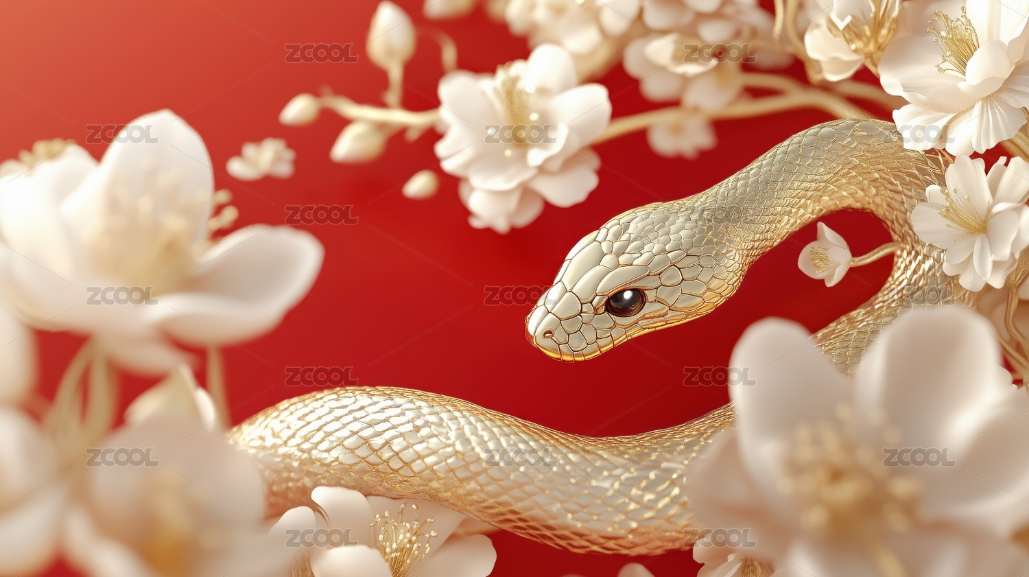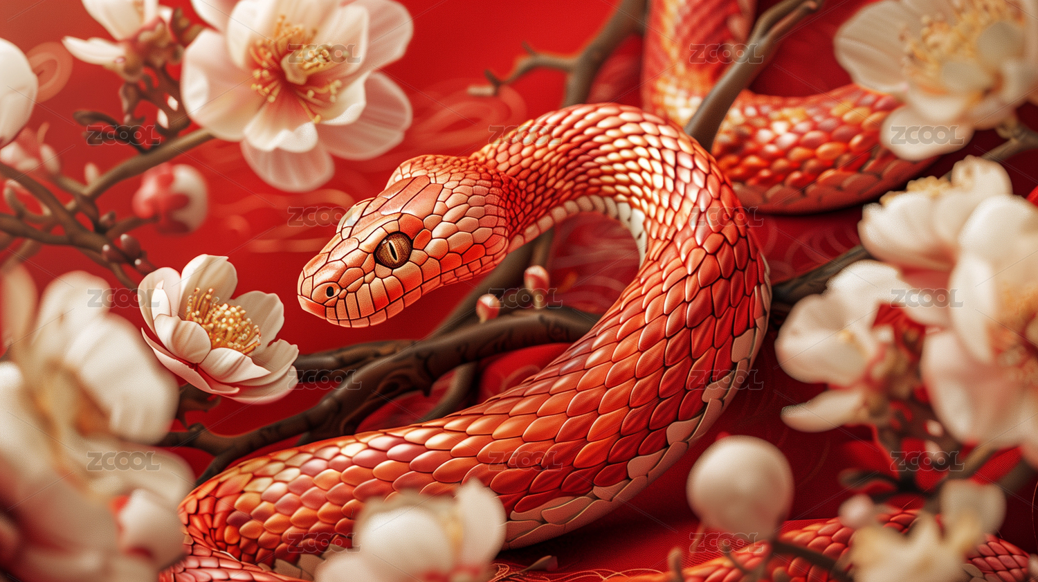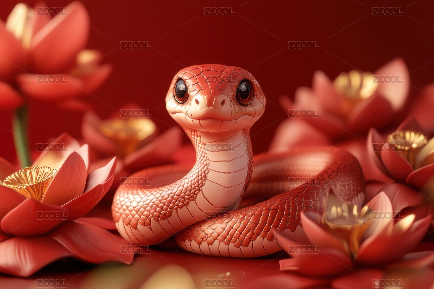 AIGCTP2024,国风,喜庆,红色,背景,花丛,金蛇,3D,立体,插画
