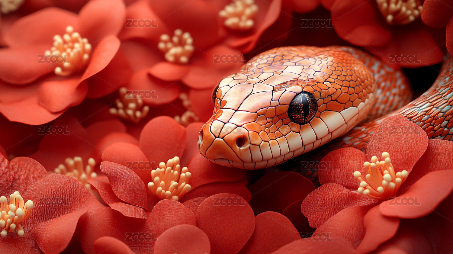 红色背景上的花朵和立体小蛇