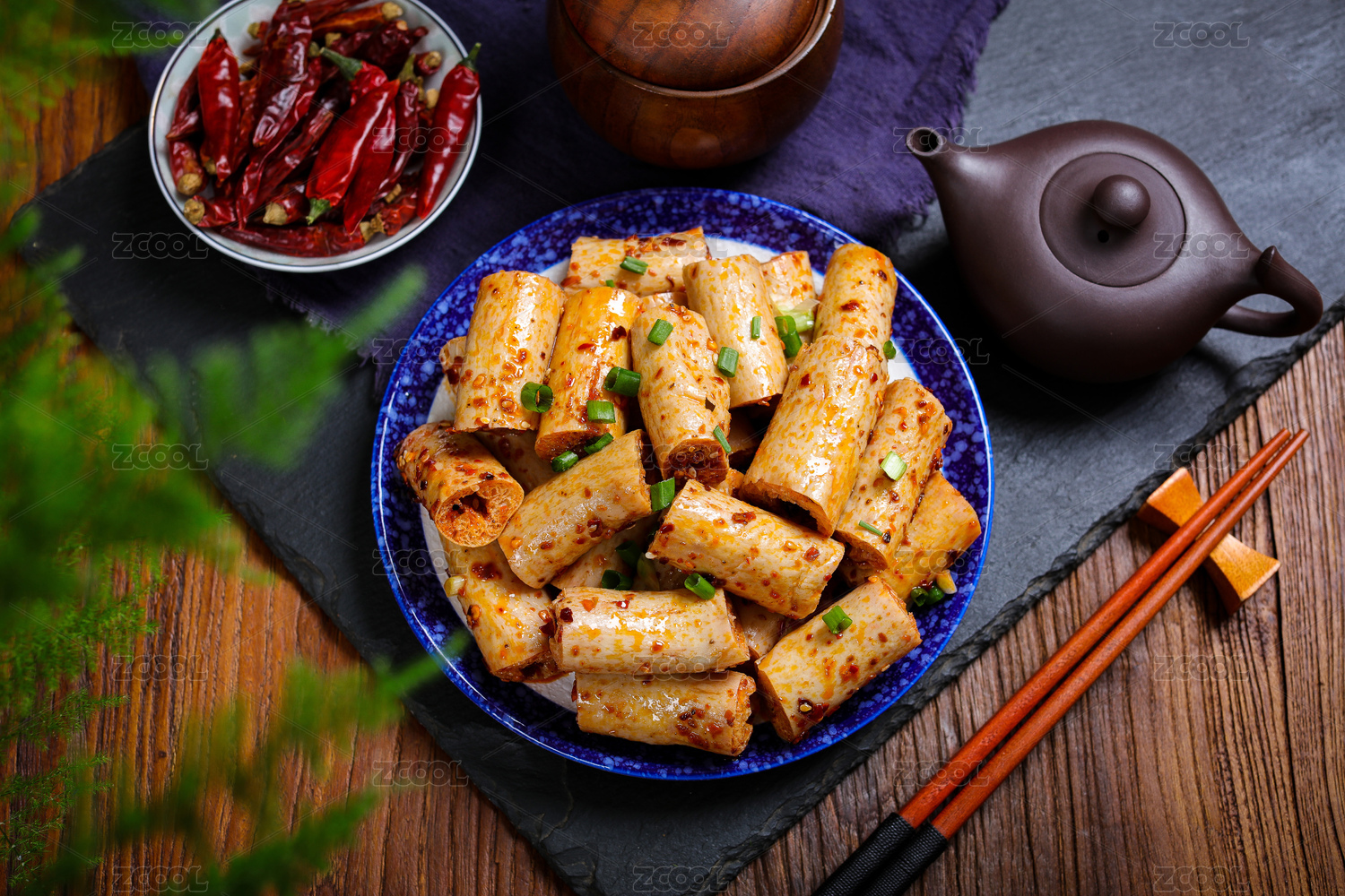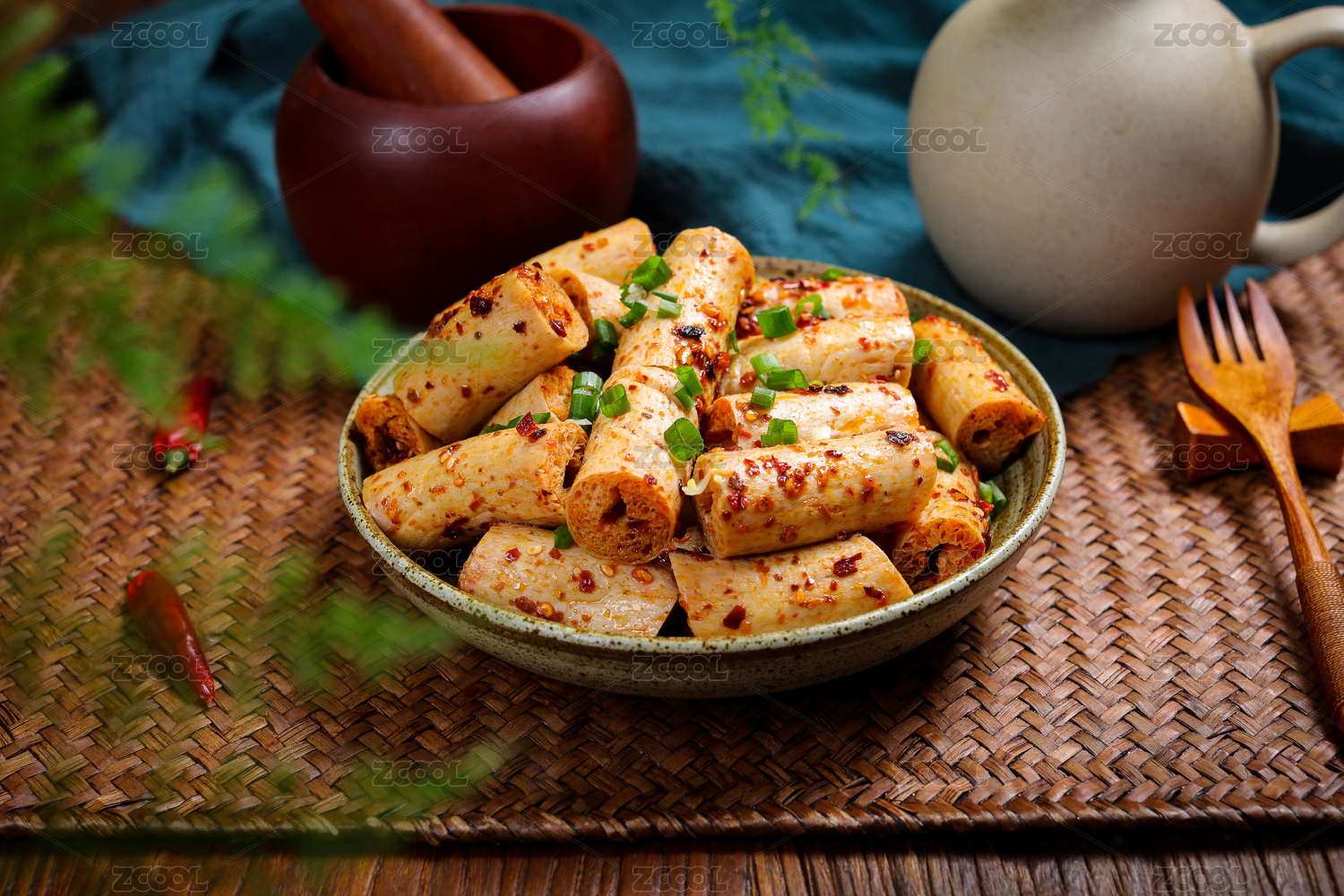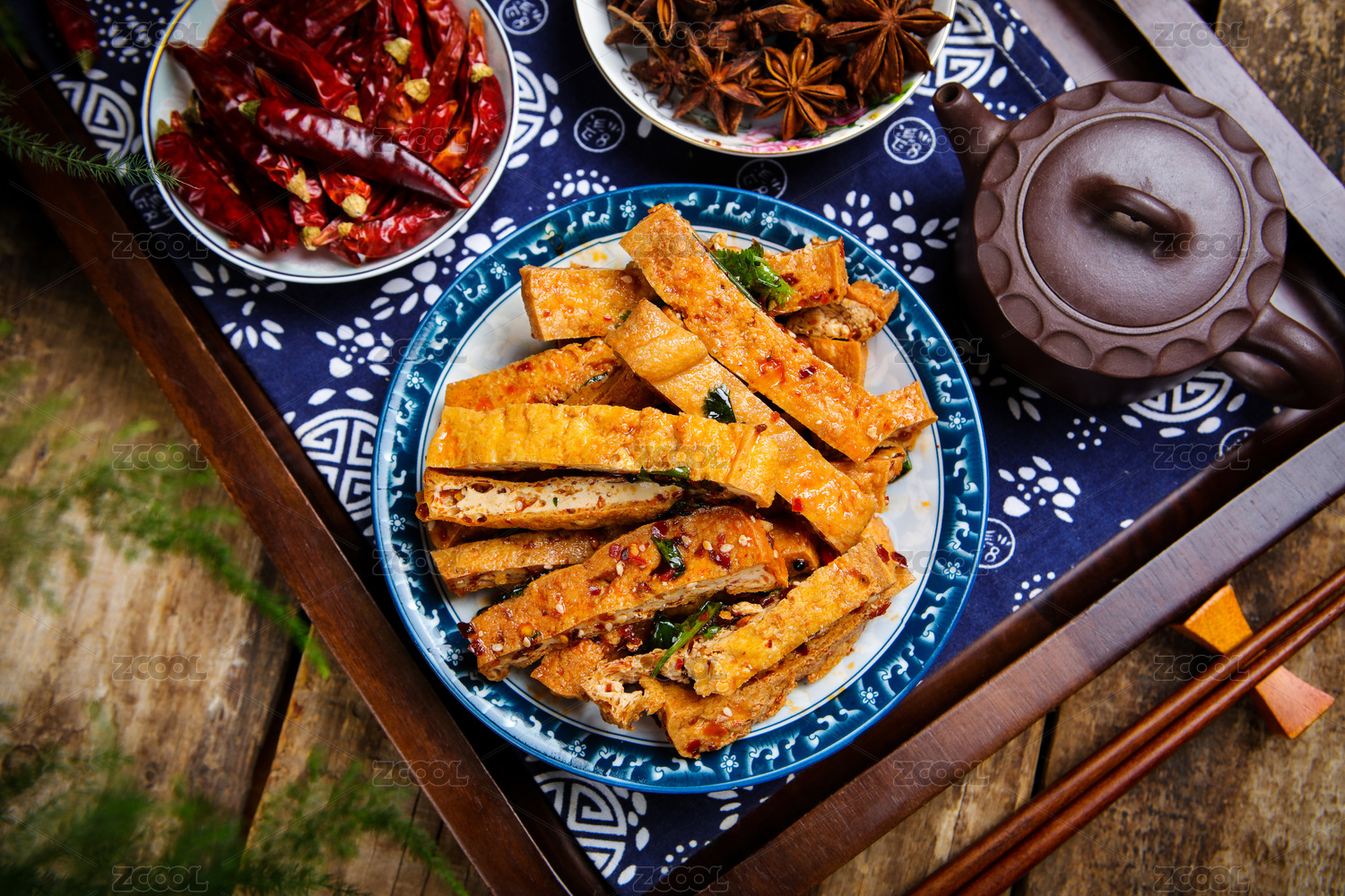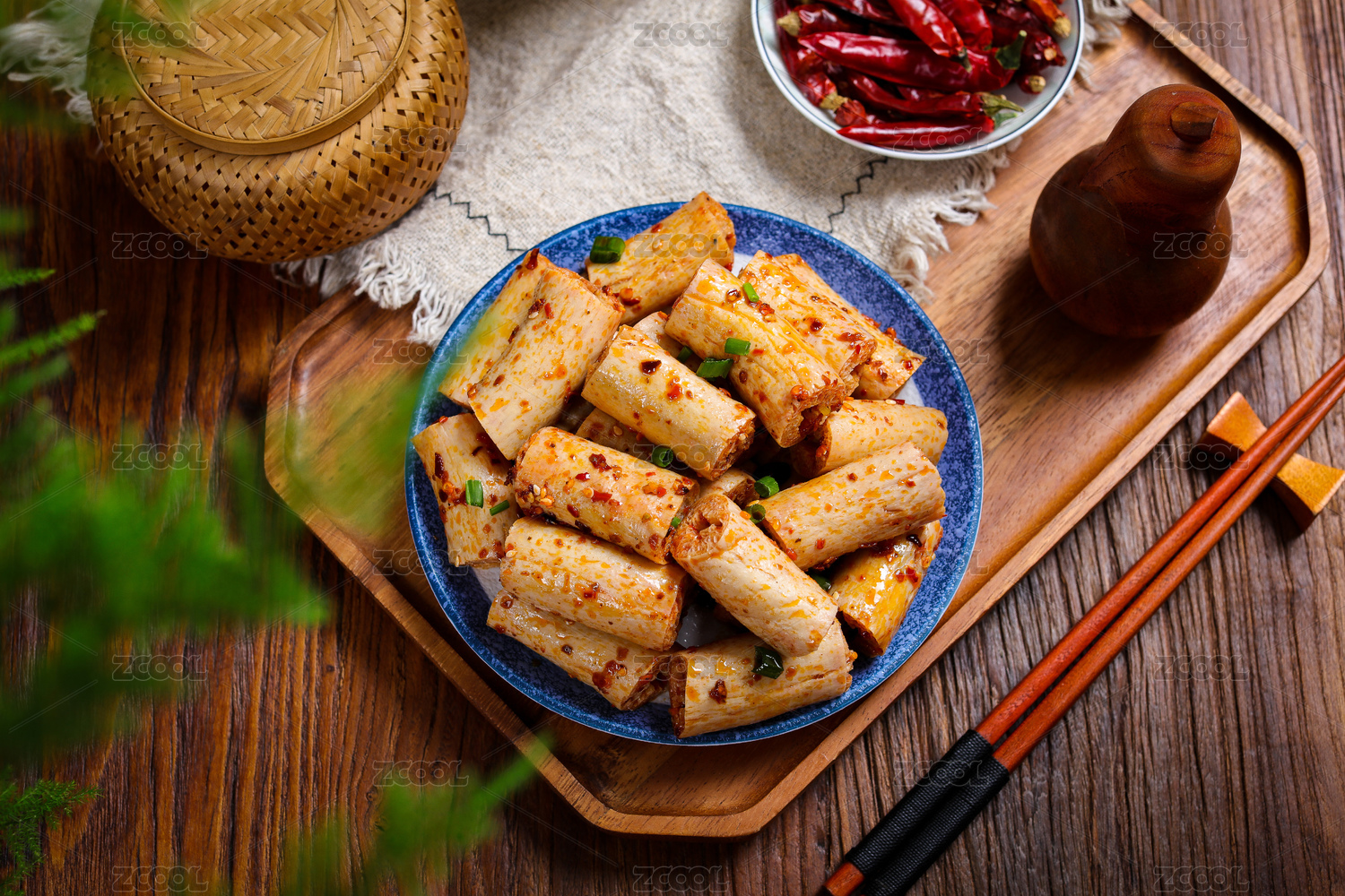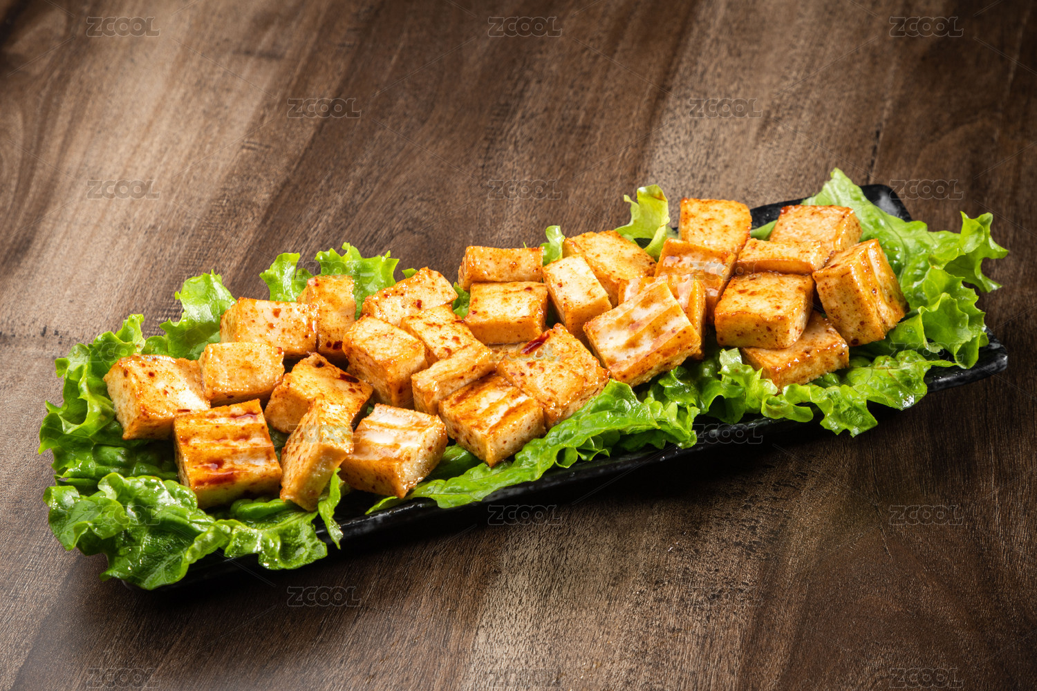 棕色木纹桌上 放着一份腌制鱼豆腐
