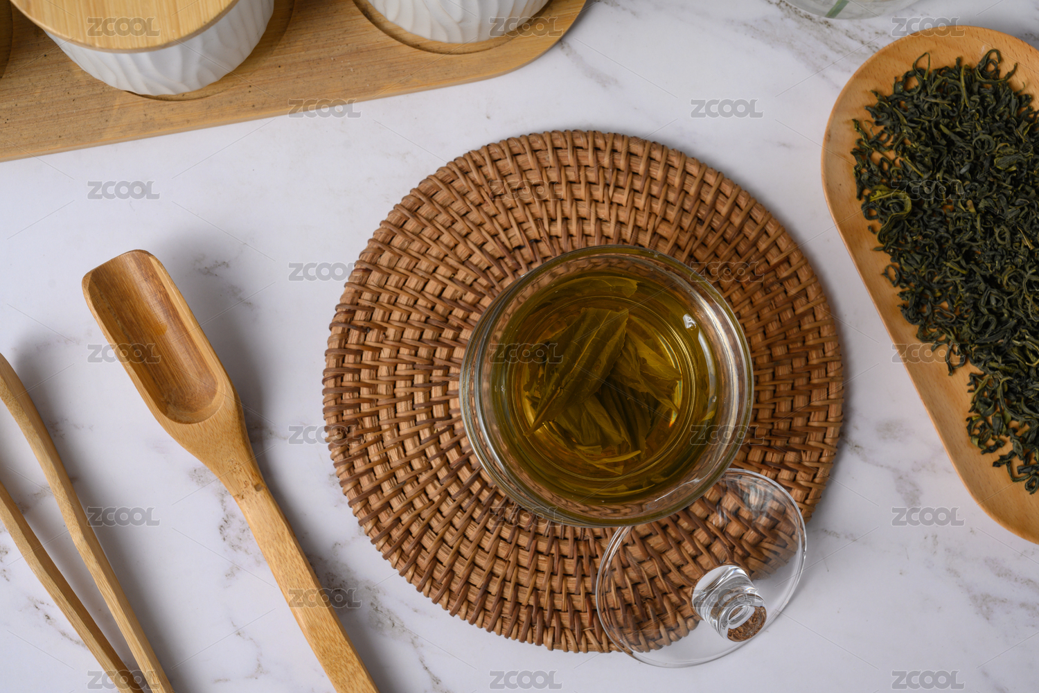 桌面上的玻璃杯子里的生津止渴的茉莉花绿茶