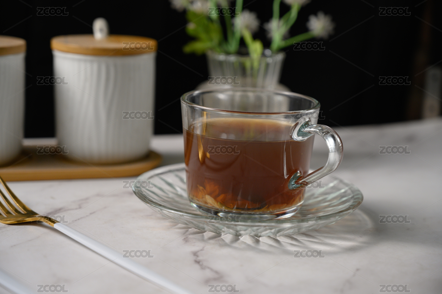 桌面上的杯子里的甘甜可口的夜交藤茶