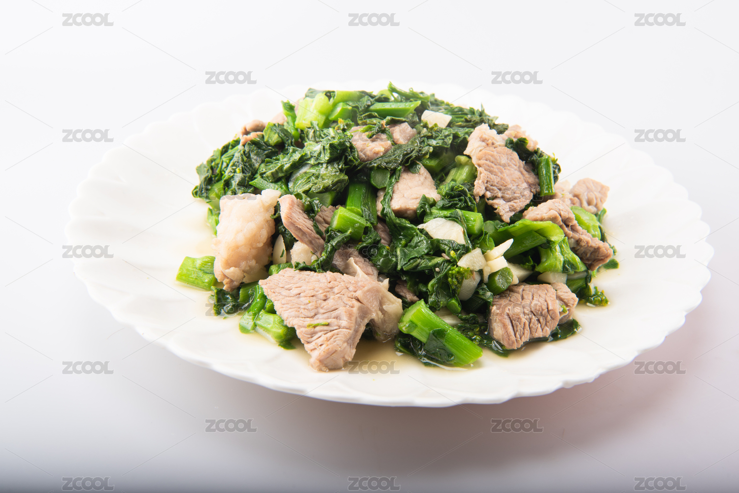 白色背景上的一盘白菜心炒瘦肉
