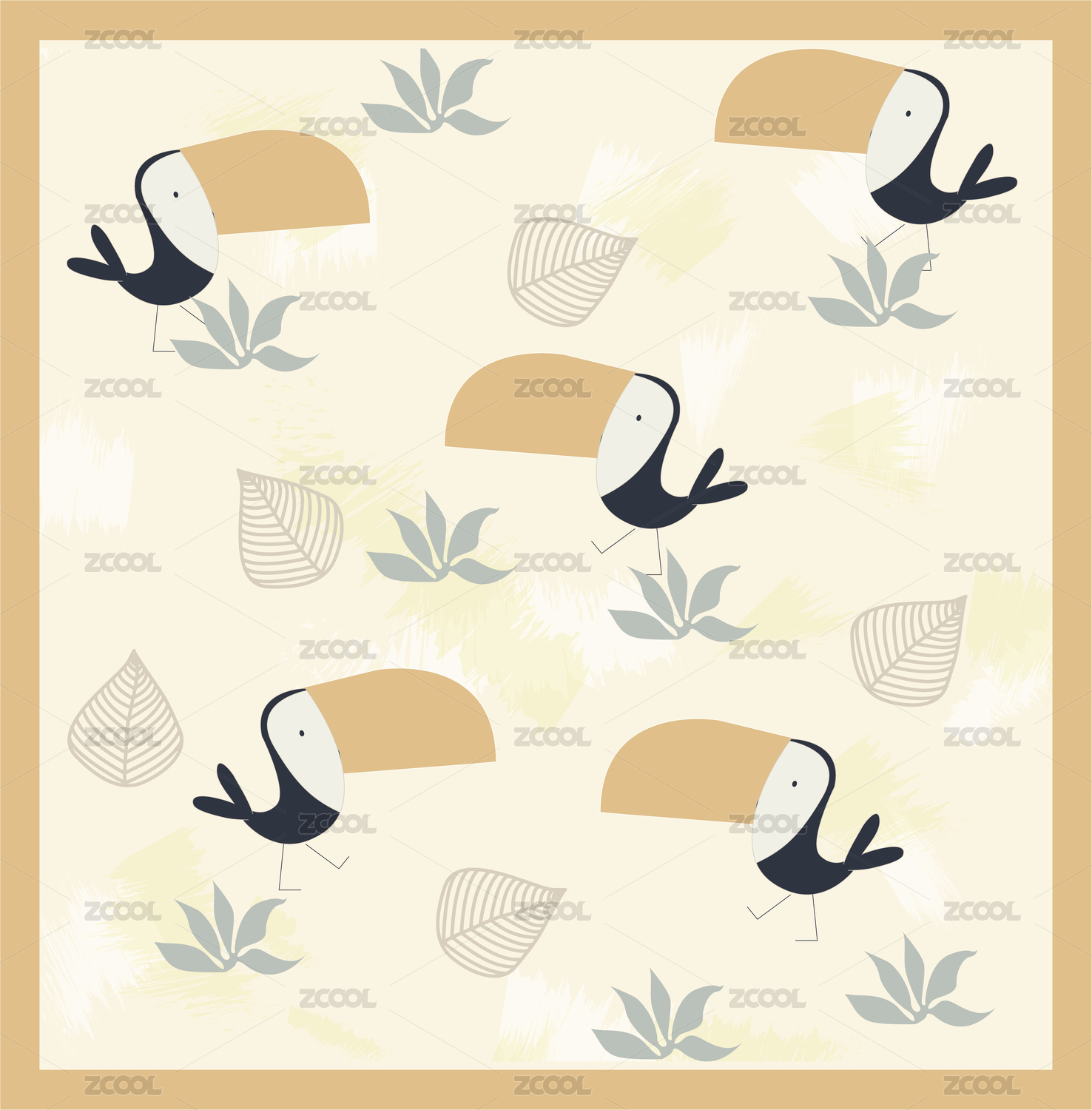热带鸟类和树叶的生动插图