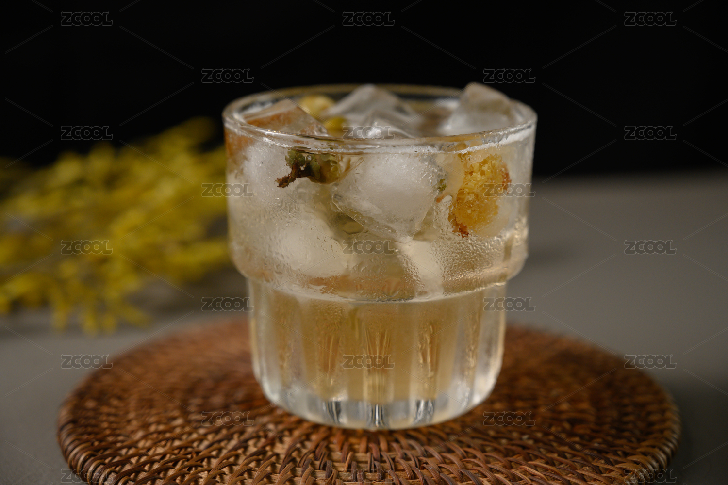 桌面上的杯子里的甘甜的冰桂花茶