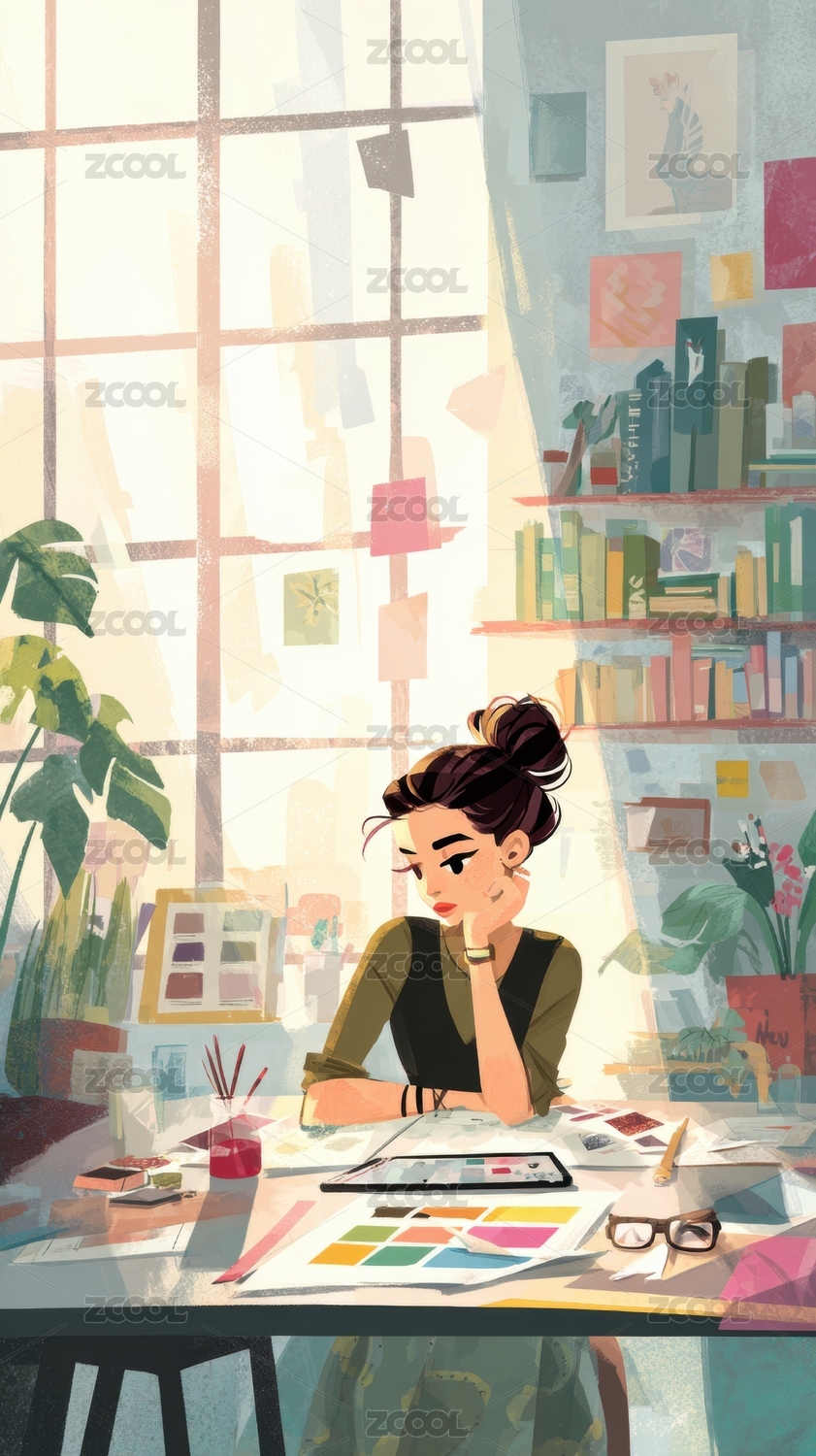 写字桌,工作,女孩,植物,治愈系,书房,扁平风