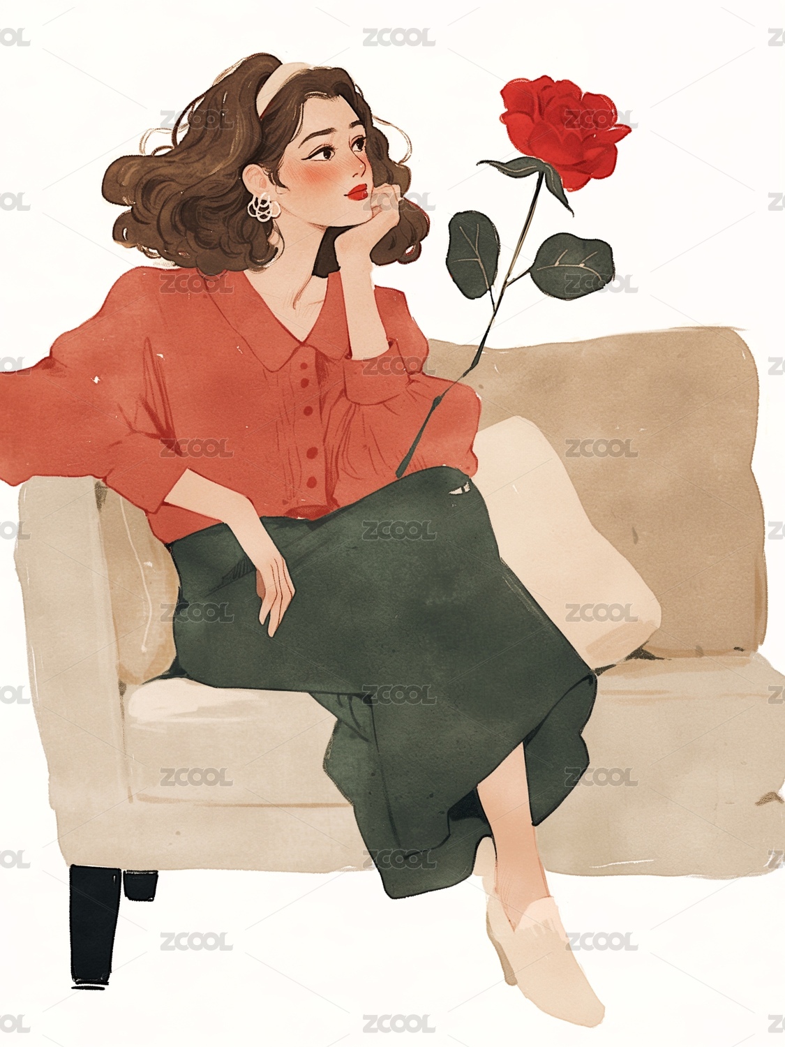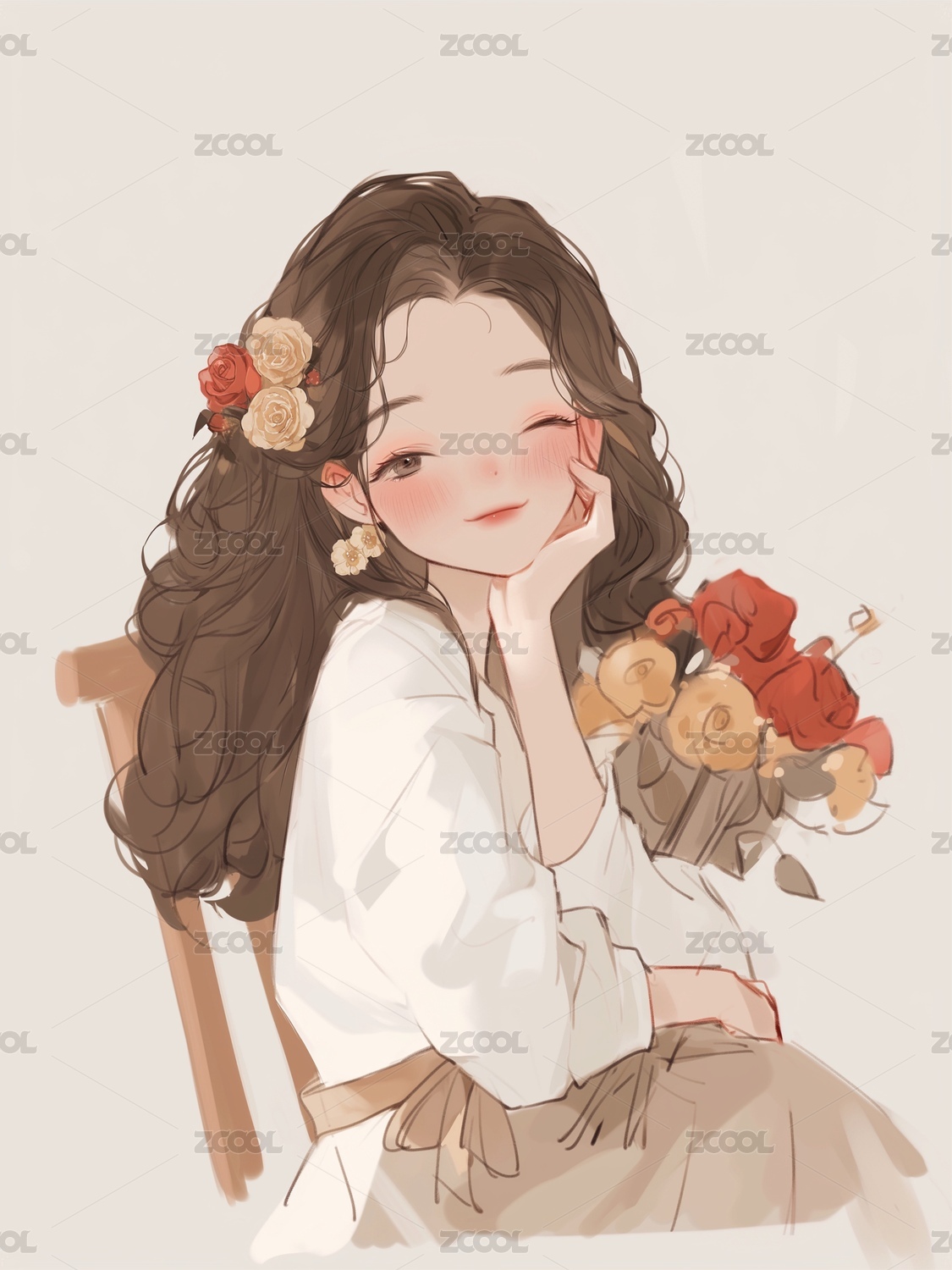 花瓶,少女,微笑,耳环,水彩风,扁平风,插画