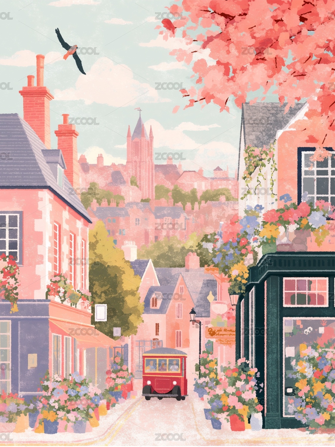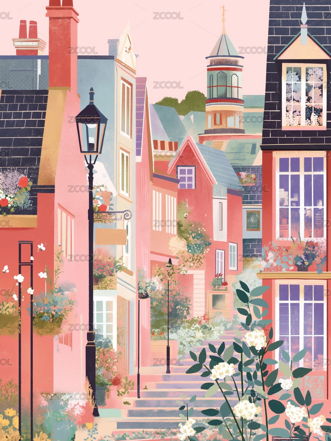 城市,建筑,鲜花,道路,路灯,粉色,扁平风,插画