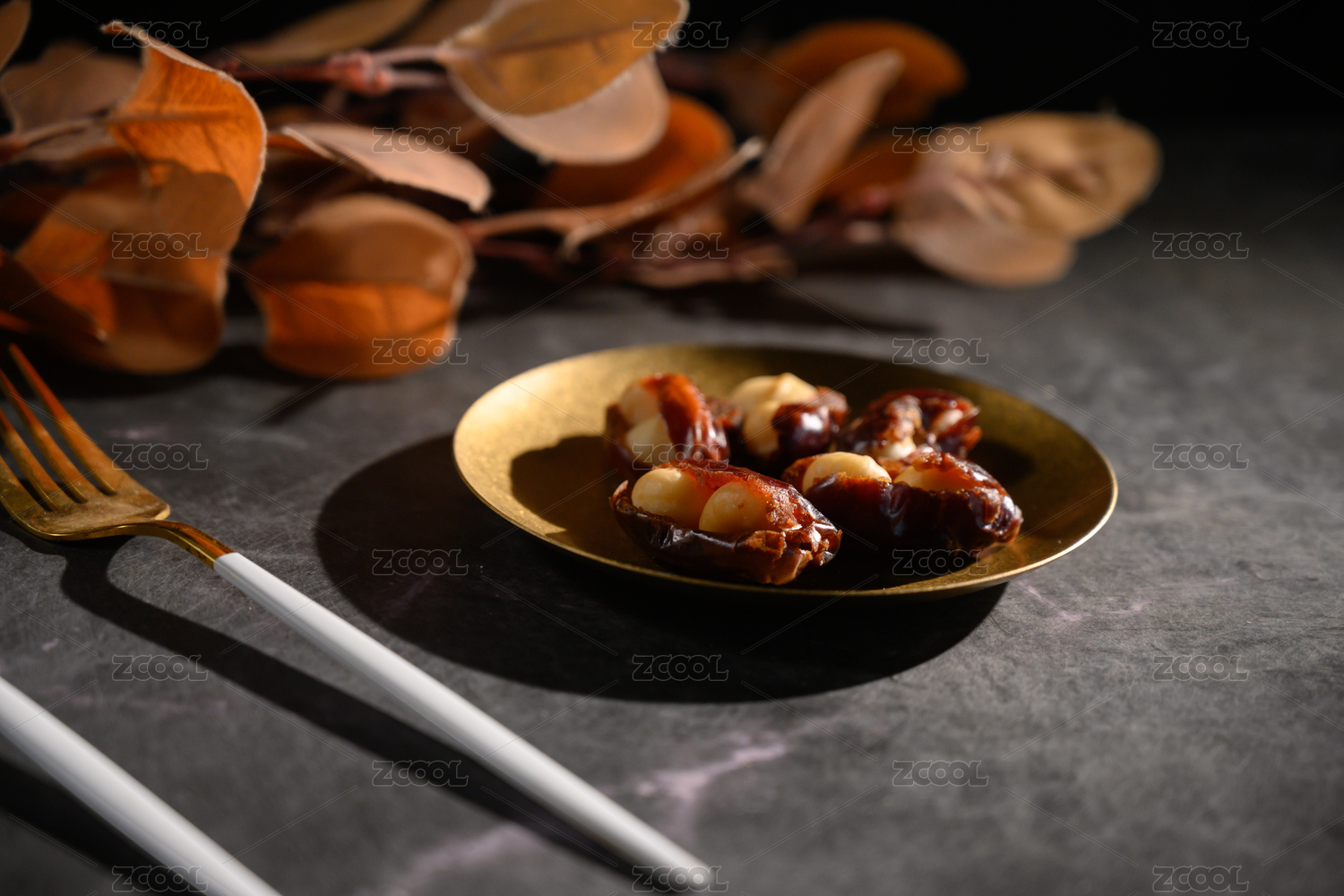 桌面上的盘子里的美味可口的椰枣夏威夷果仁