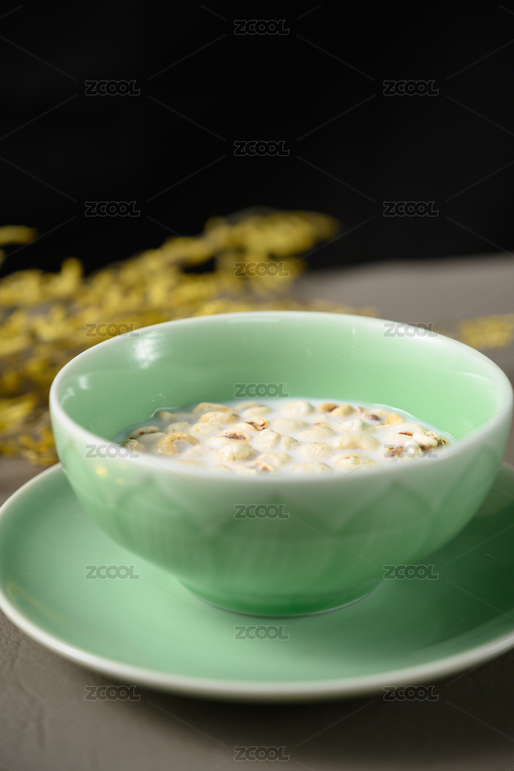 桌面上的盘子里的牛奶鹰嘴豆片