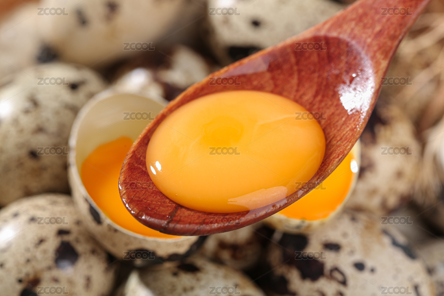 碟子里放着鹌鹑蛋和勺子上挖着鹌鹑蛋黄