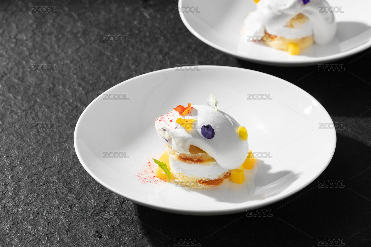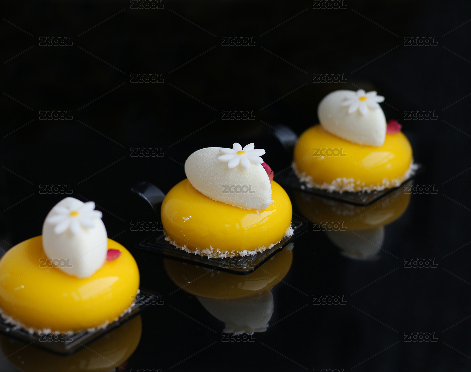 黑色背景下的圆形芒果淋面慕斯蛋糕