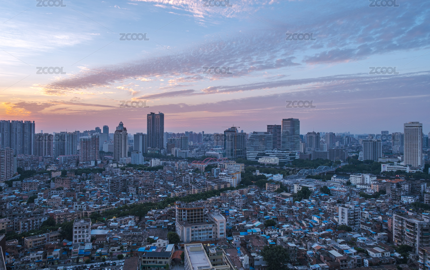 广州城市高楼建筑群与日出朝霞云彩全景风光