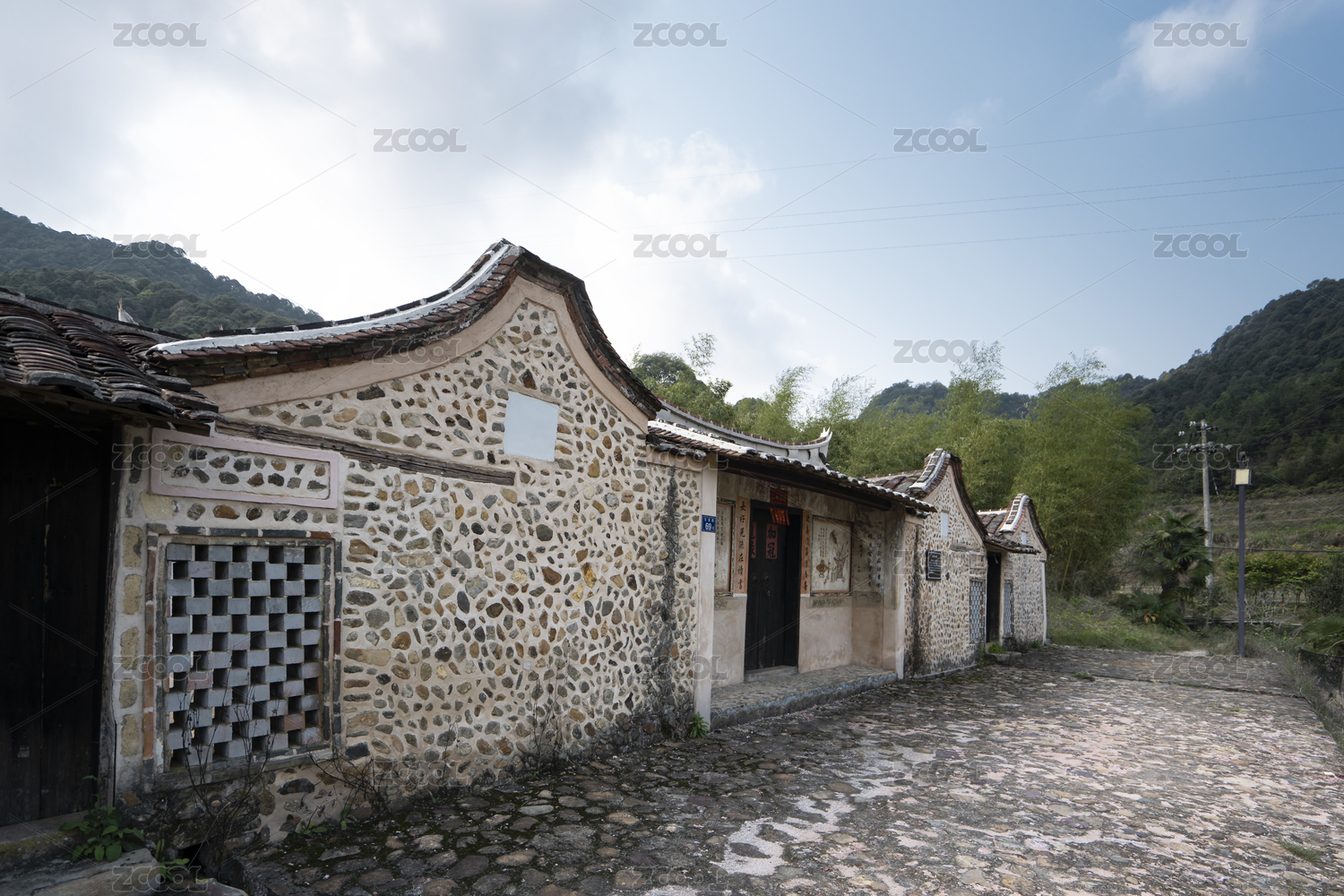 乡间一幢石头古厝及其前面的鹅卵石平台