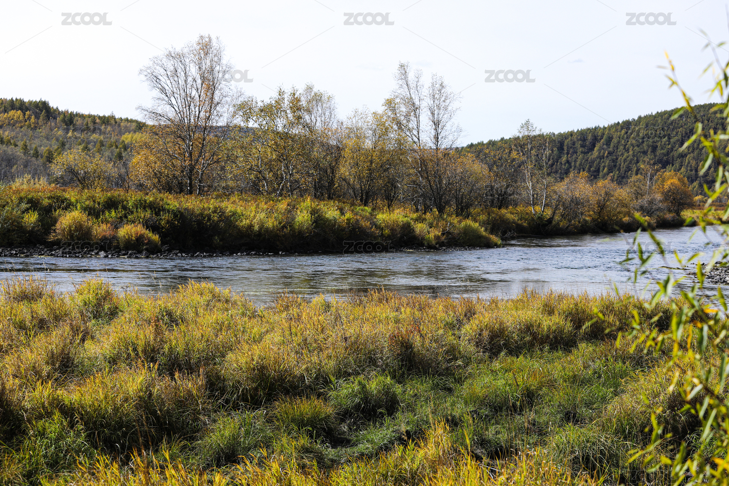 内蒙古阿尔山秋天里的河流和金黄色森林风景