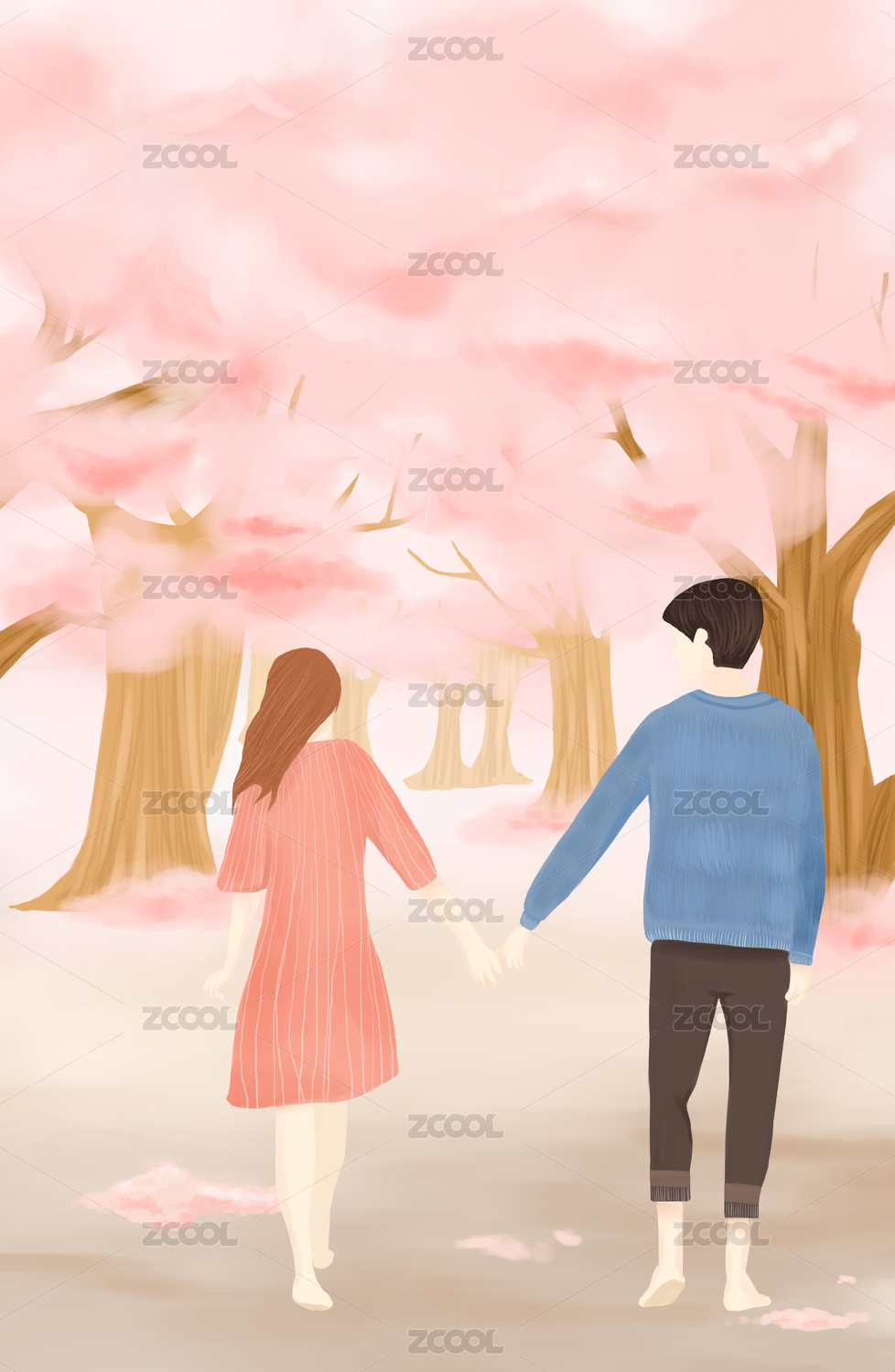 春天一对情侣手牵手在樱花树下漫步手绘插画竖版