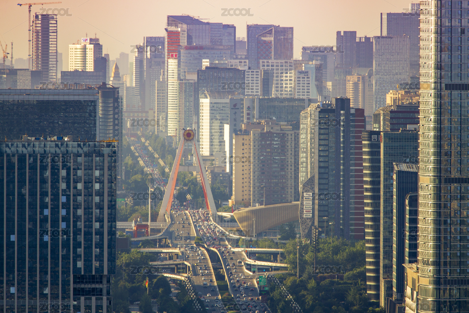 俯瞰黄昏金光中的北京繁华城市密集建筑群