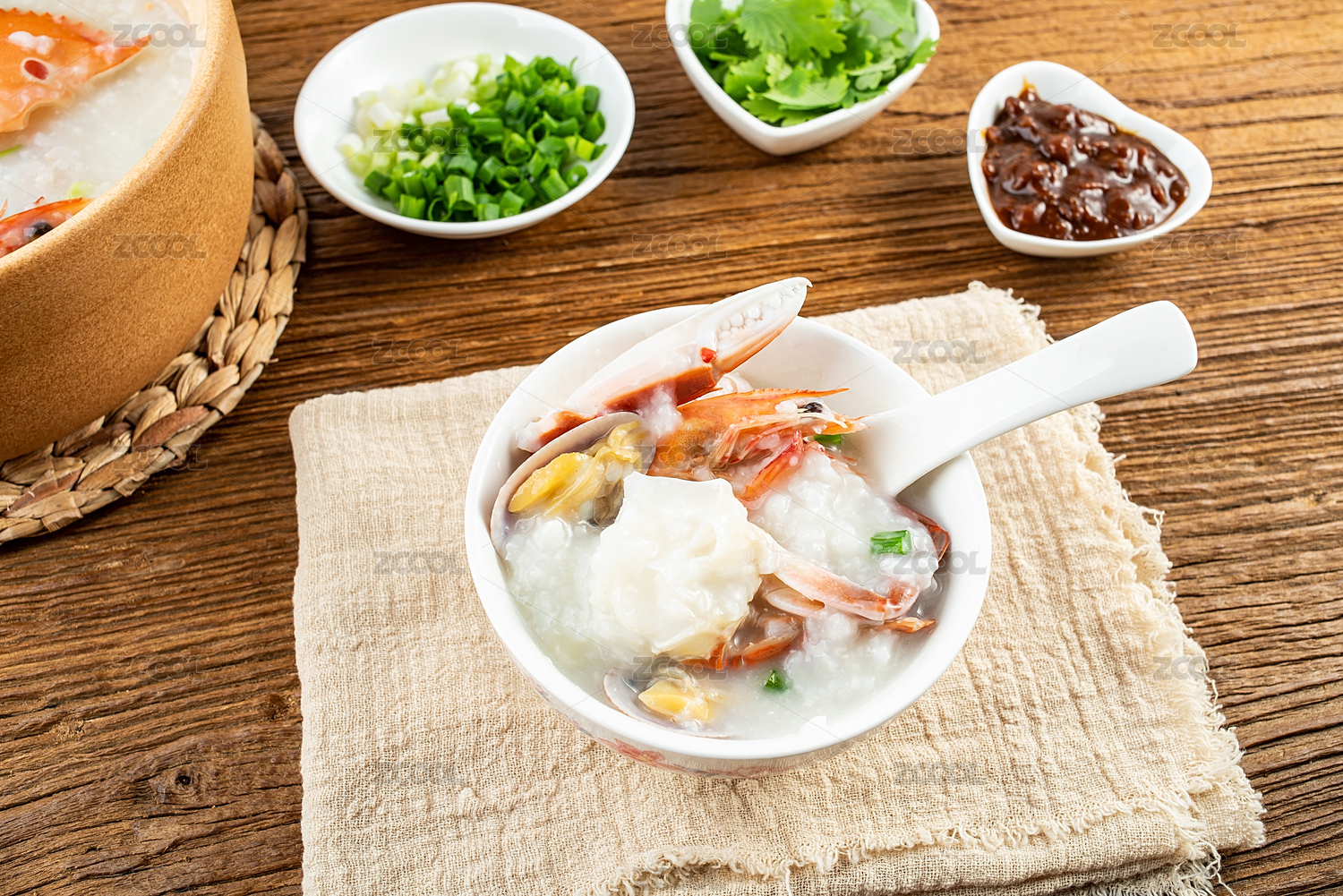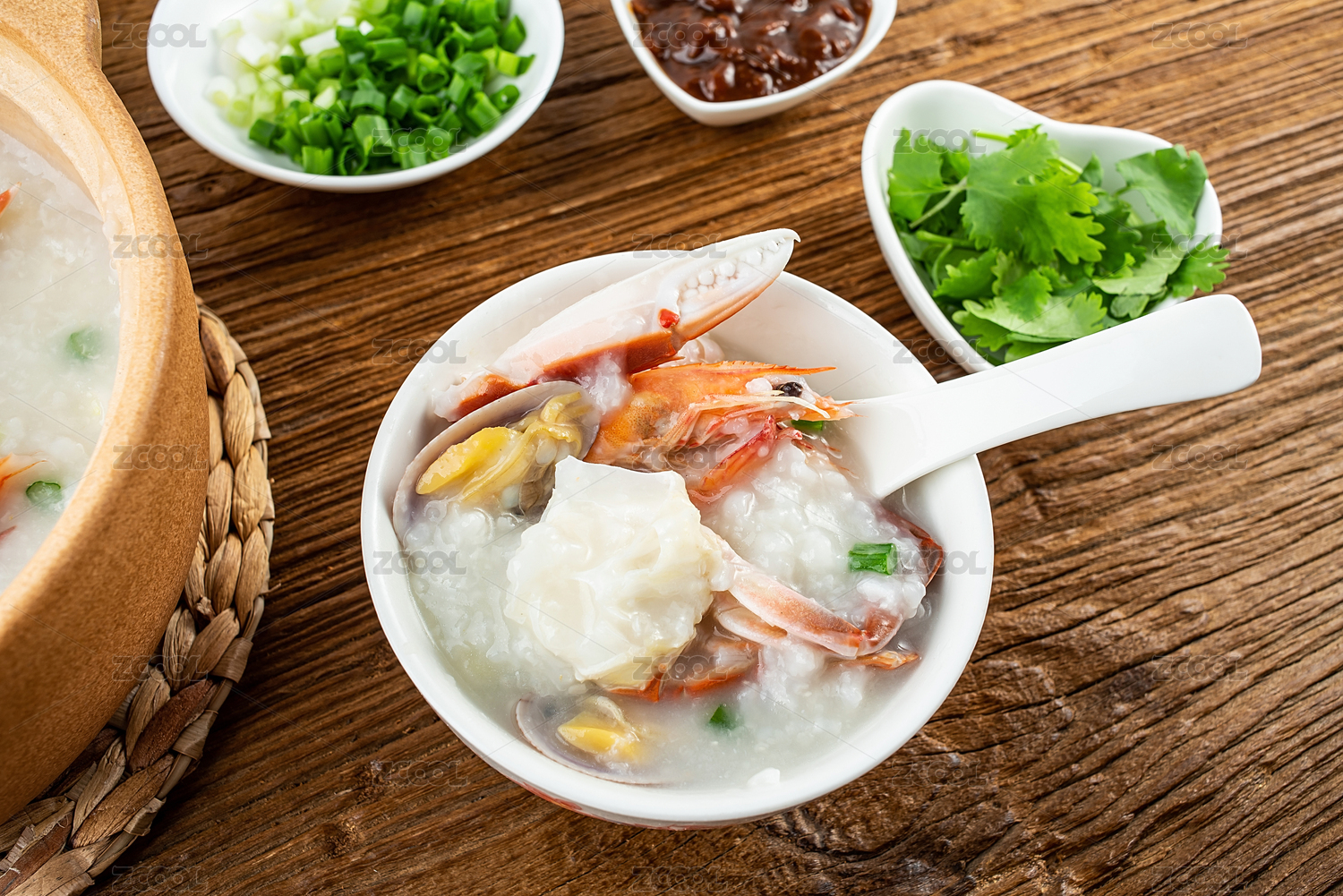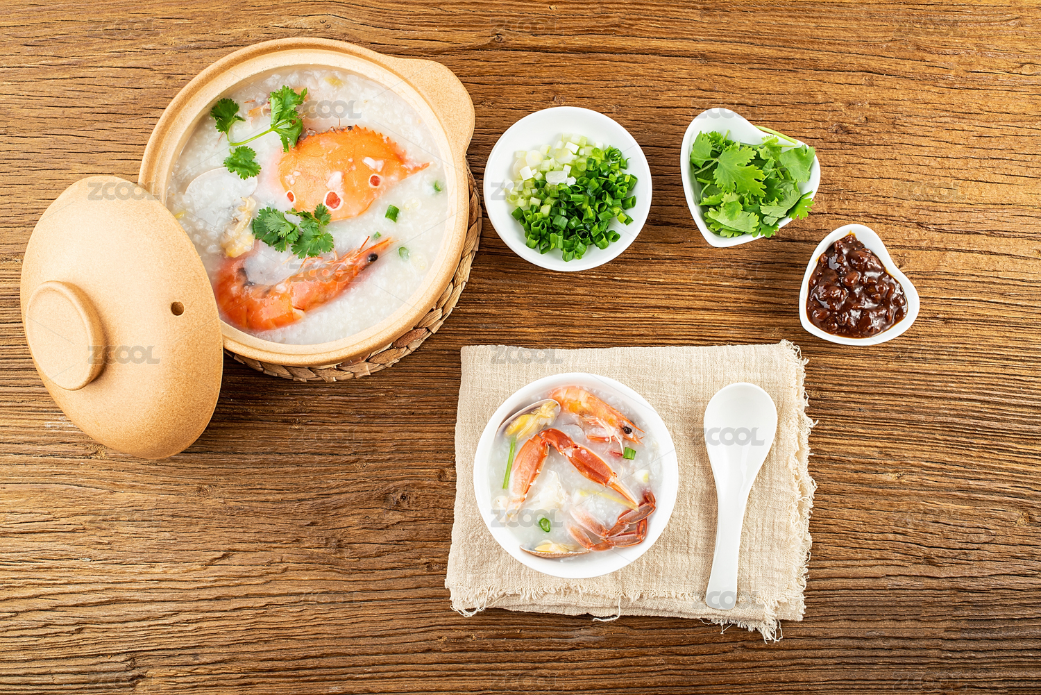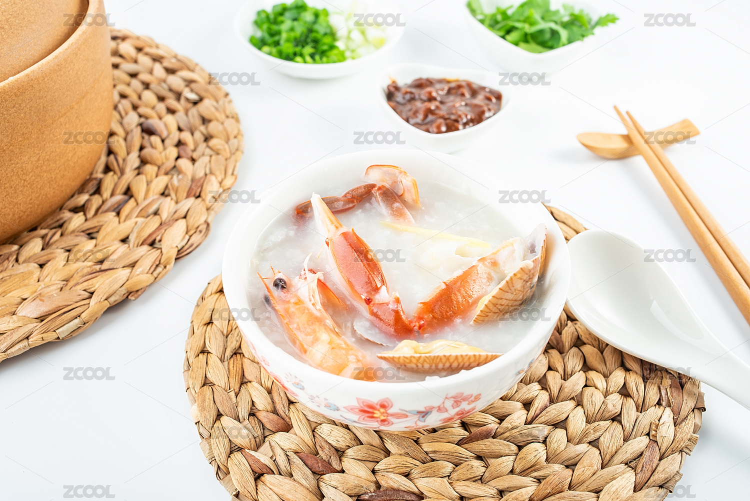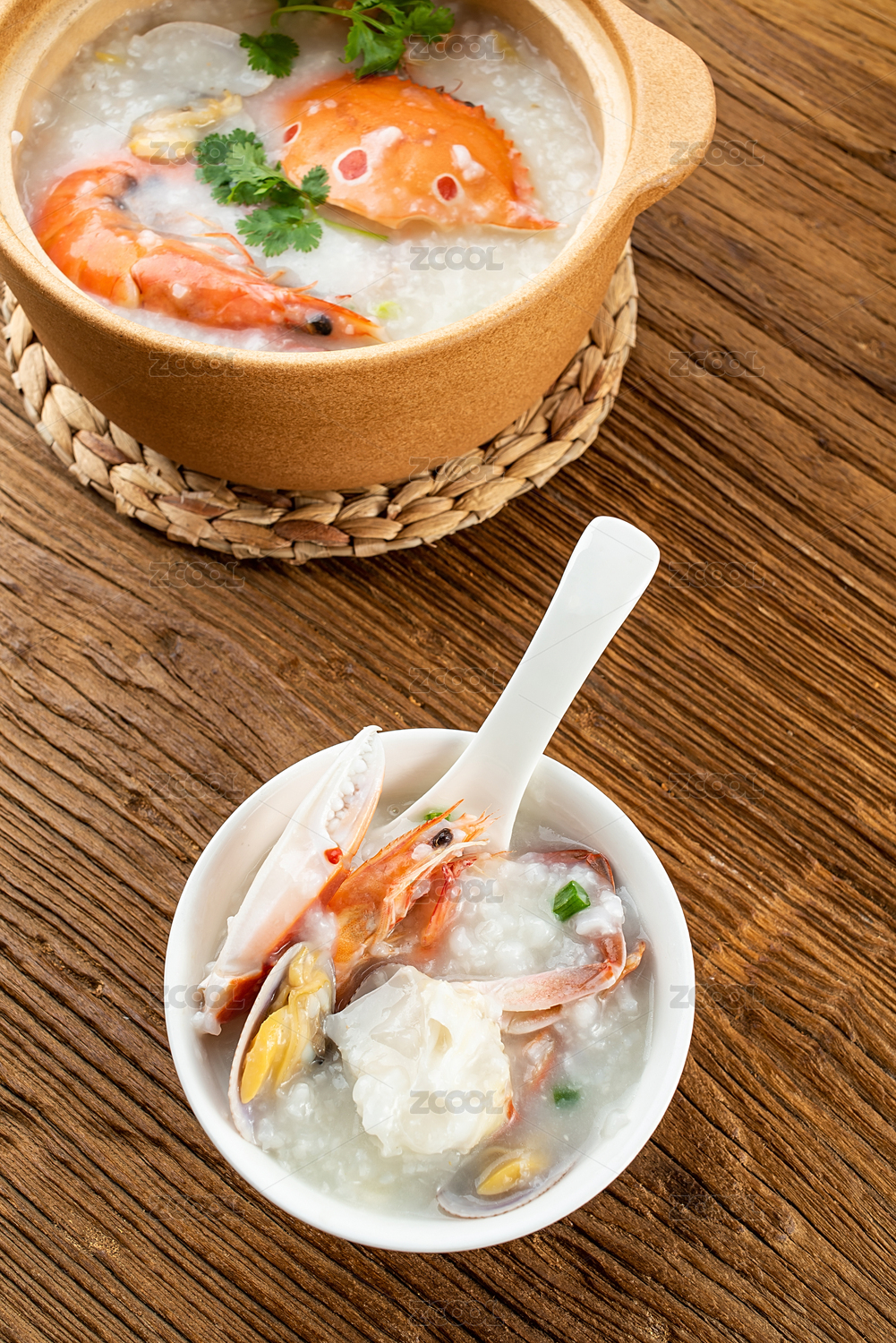 木托盘上一碗营养美味的螃蟹海鲜粥