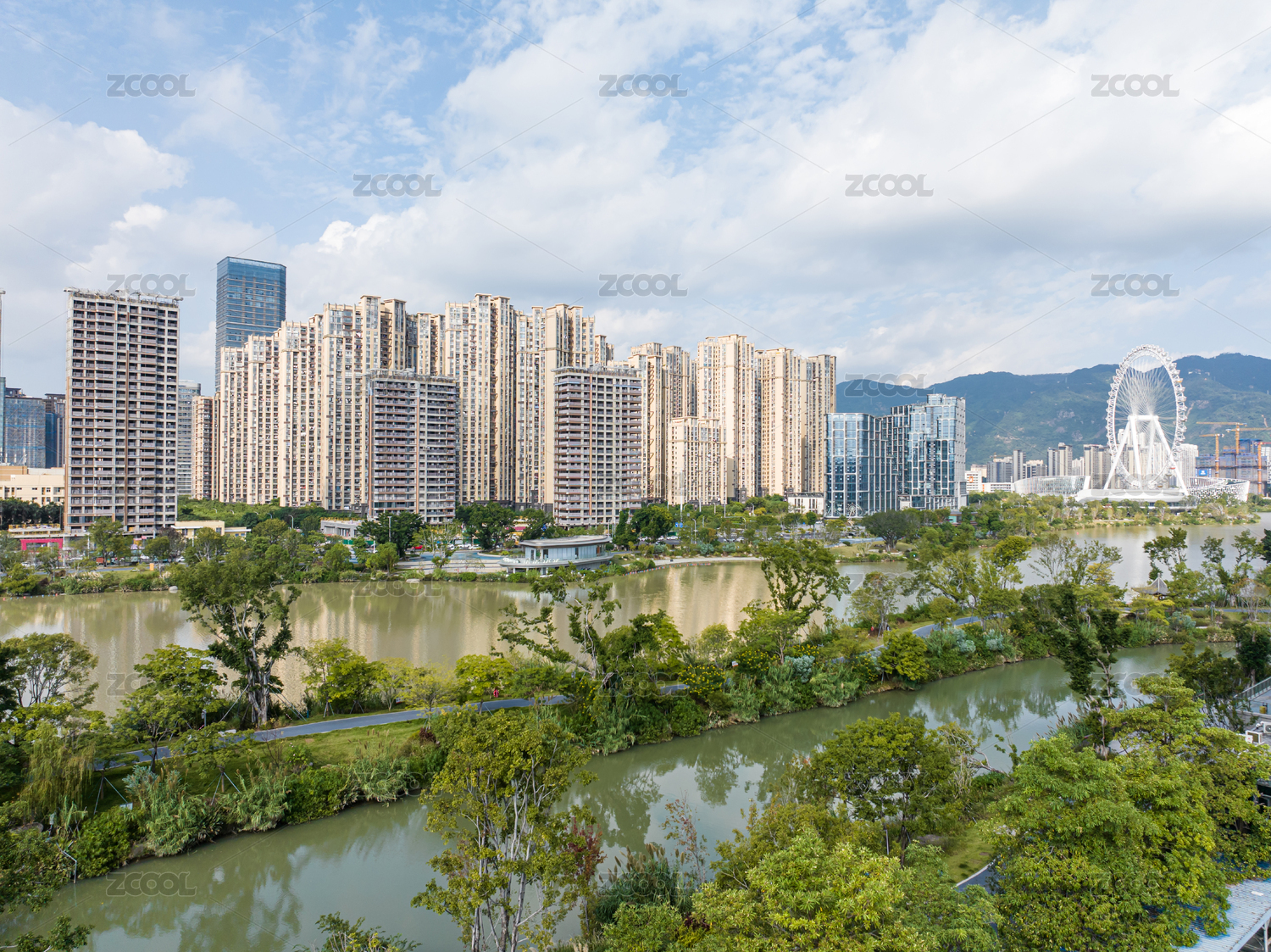 中国广州市南沙区凤凰湖公园环境优美的湖景楼盘住宅区