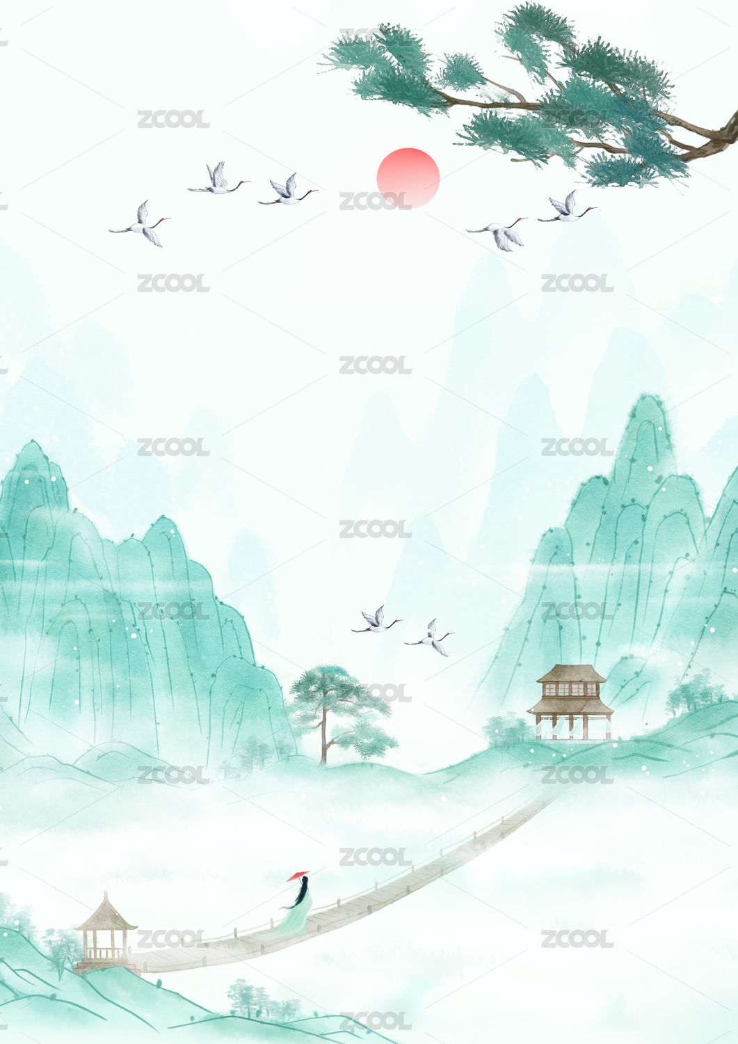 古风水墨山水画松鹤云海