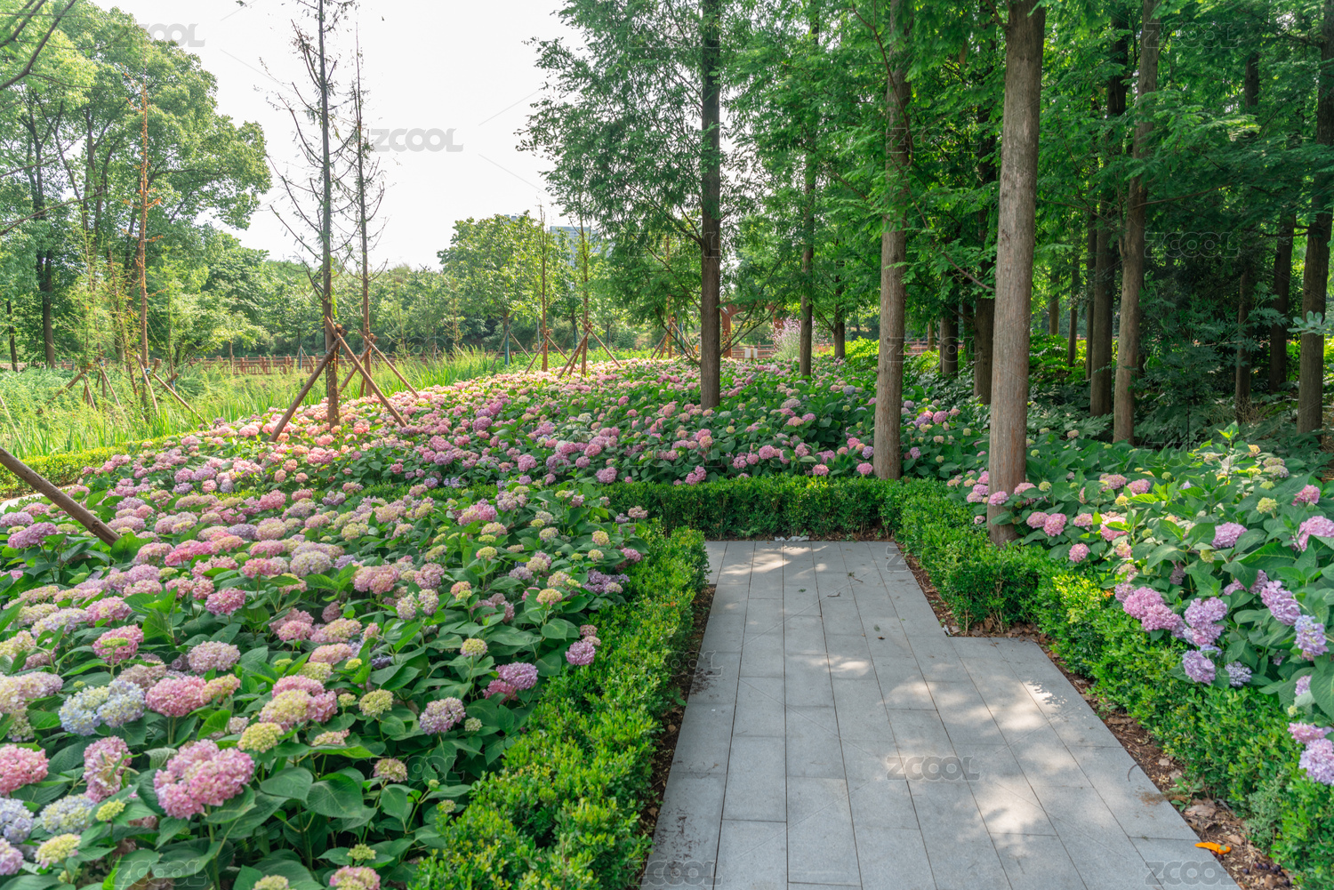 公园春天自然景观茂盛的树林和盛放的锦秀杜
