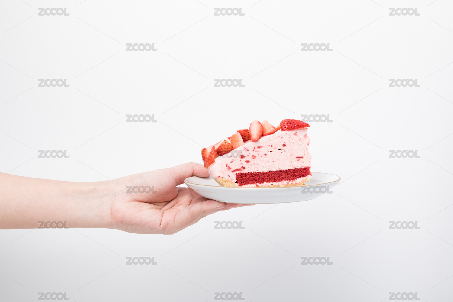 一只手拿着草莓切片蛋糕
