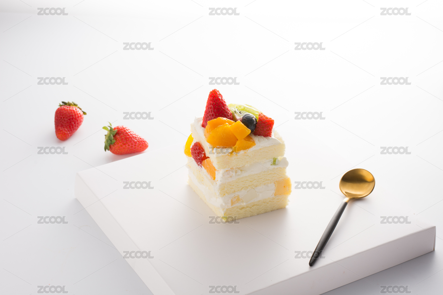 白色桌面上放着一盘草莓切片蛋糕