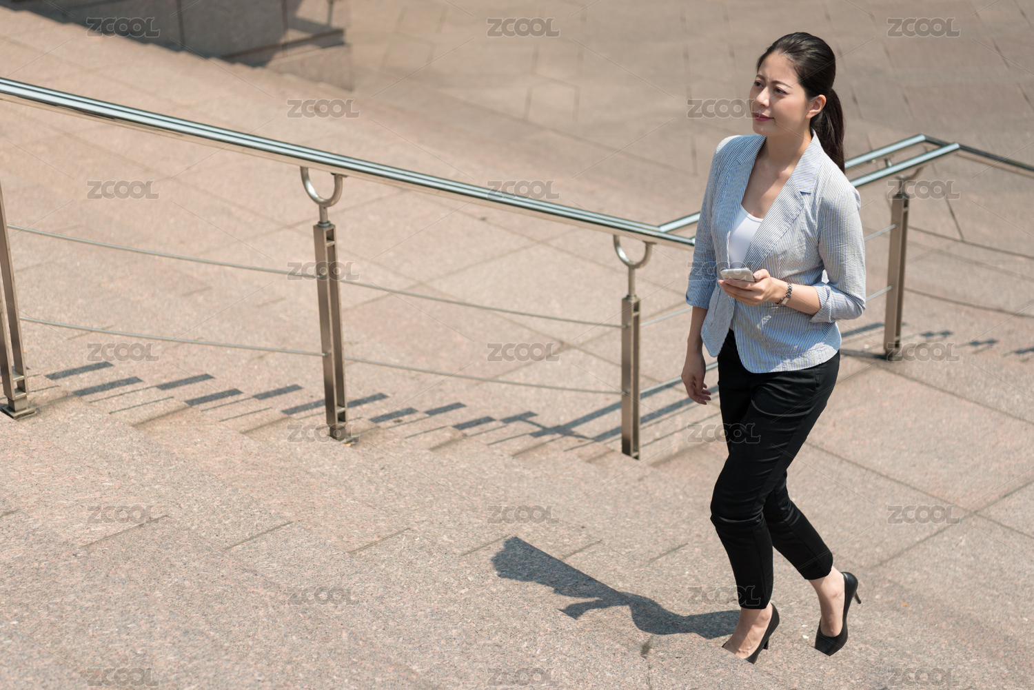 亚洲办公室女郎走在在阳光好日子楼梯,手持智能手机,并准备上去了公司办公室外。