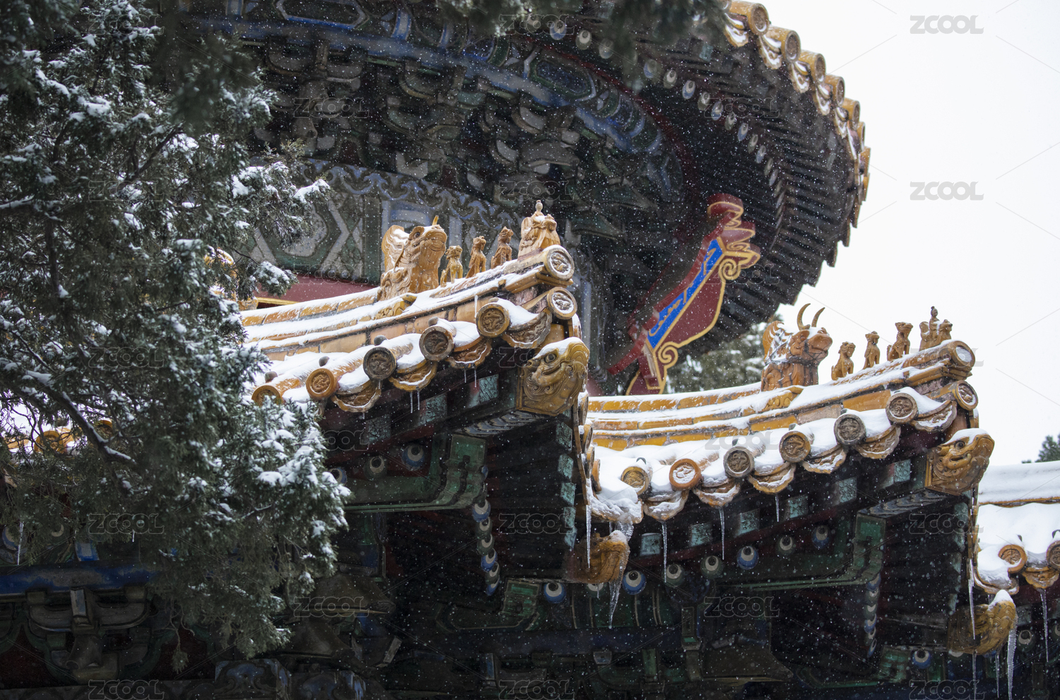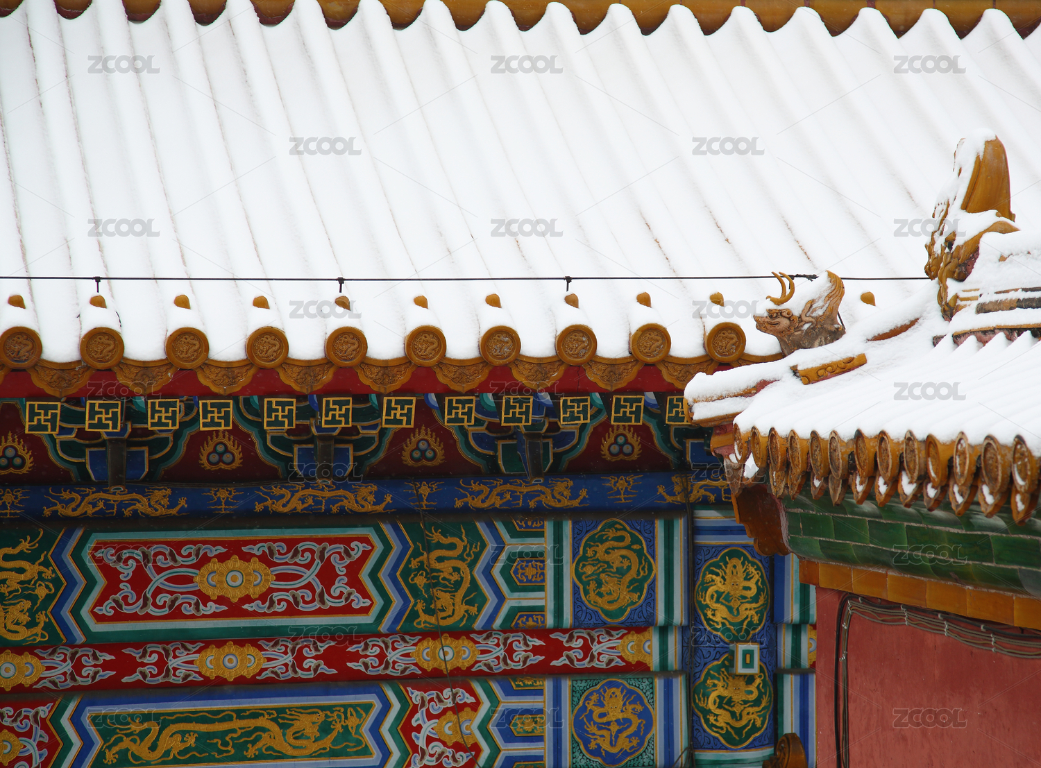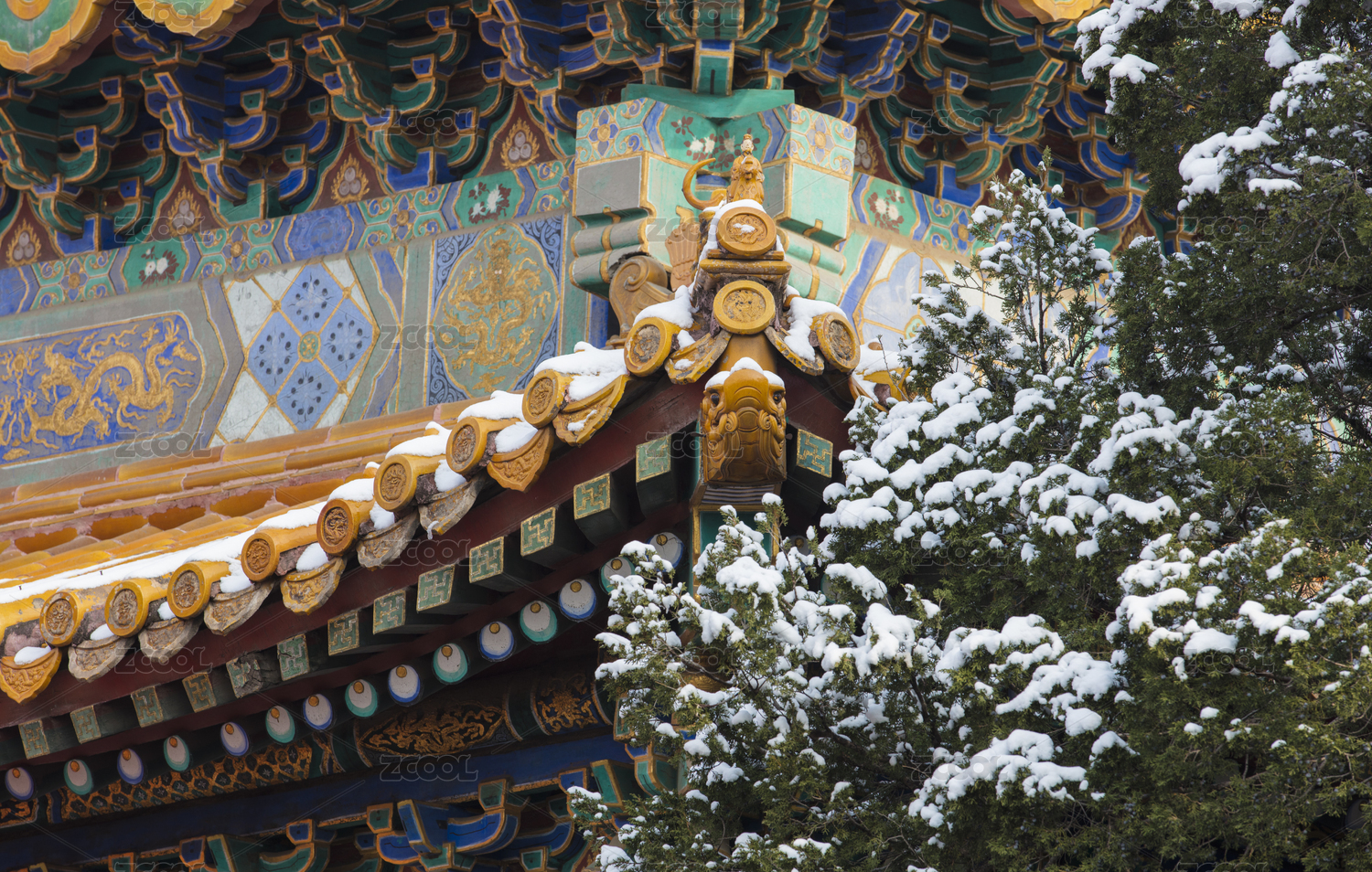 冬天寒冷大雪建筑历史屋檐彩绘旅游背景老君