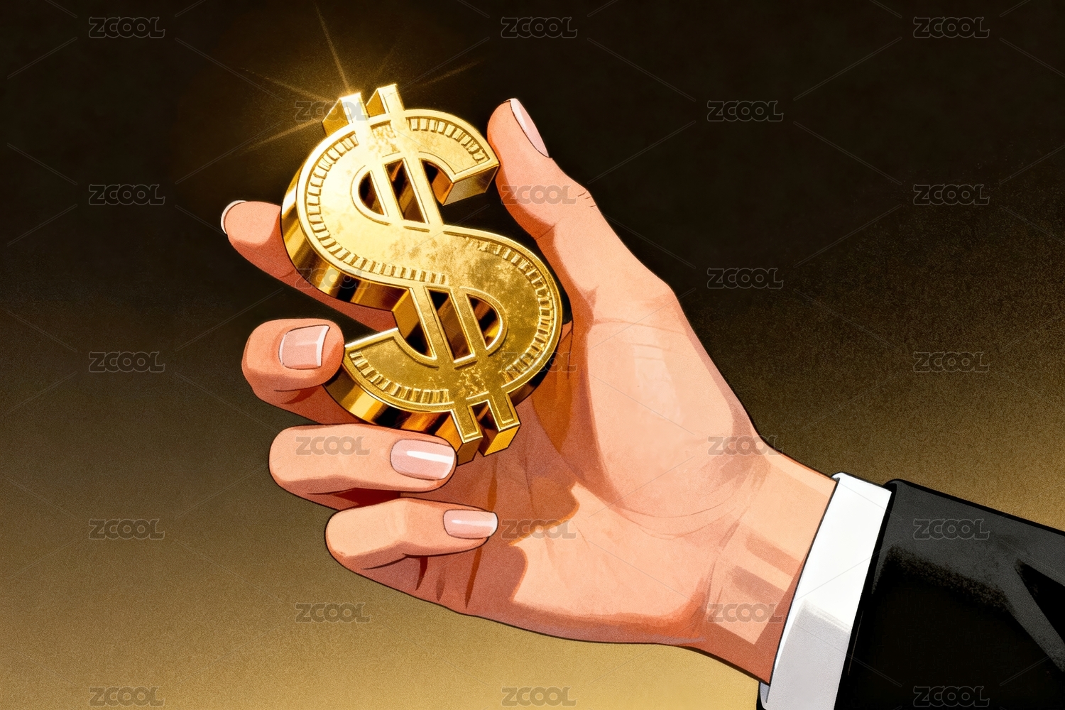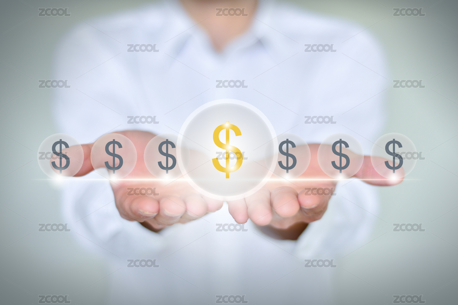一个商务人士手指着金钱美元符号虚拟数字货币区块链投资理财概念