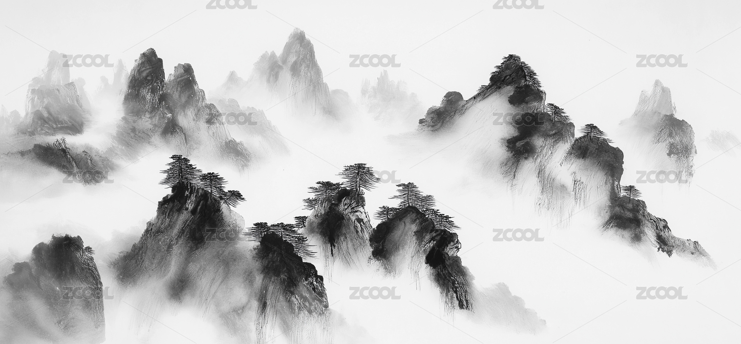 黑白中国风水墨风山水画,手绘国风意境水墨