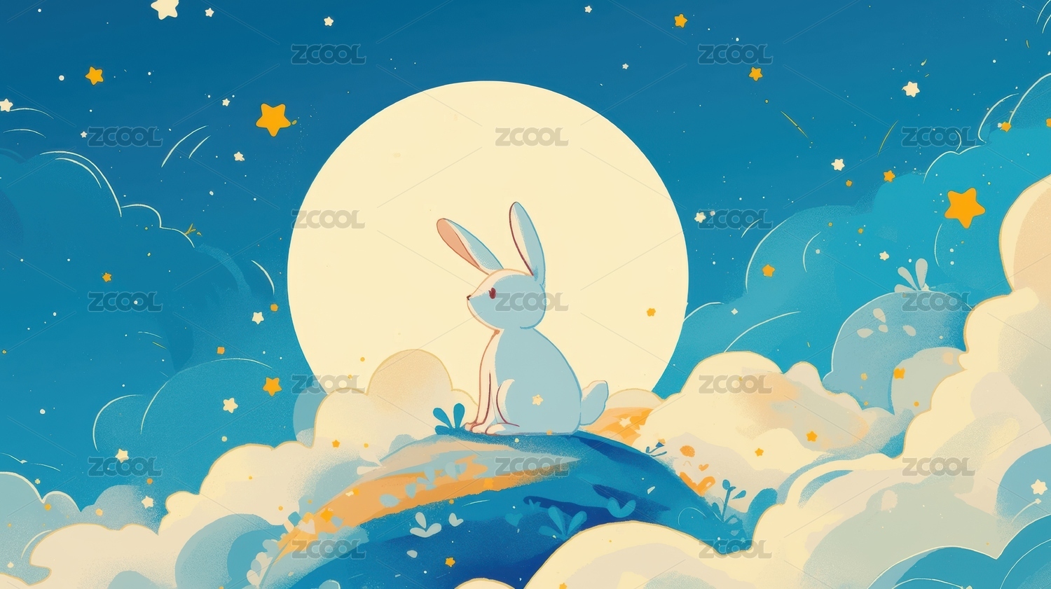 中秋节插画夜晚一只兔子蹲在望向天空的月亮