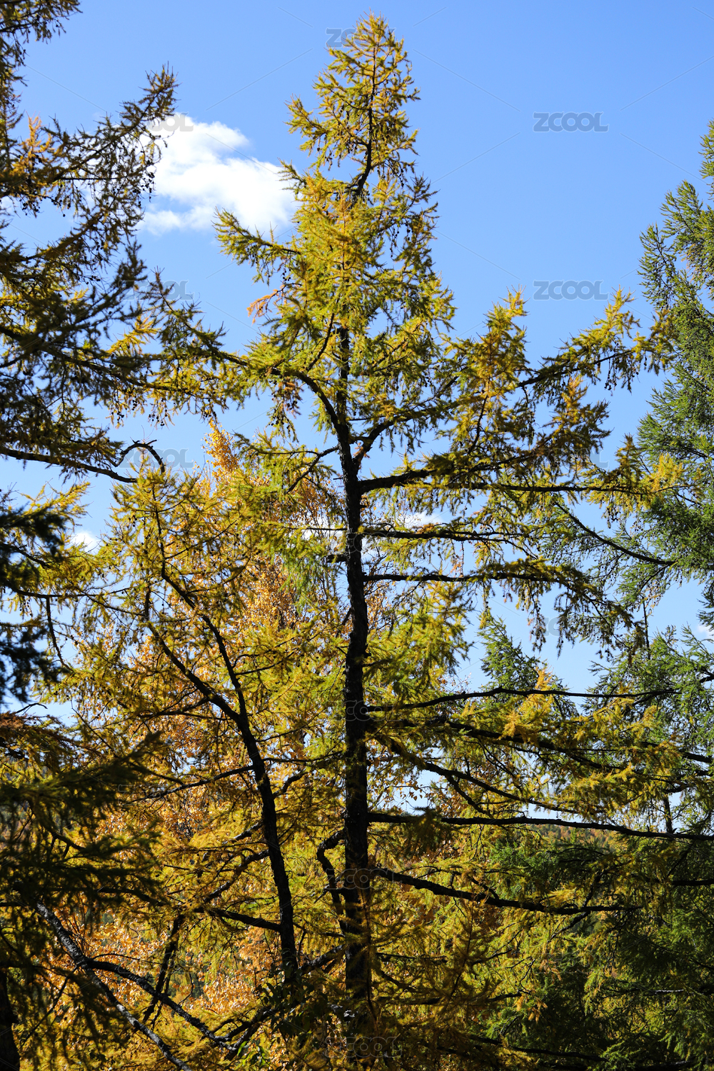 深秋蓝天下满树黄叶的树木