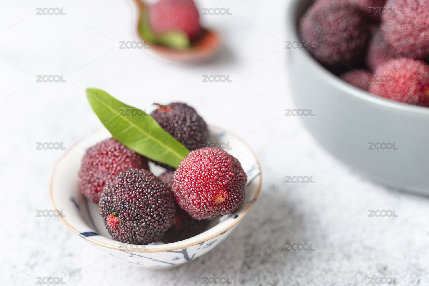 一木碗红色的中国杨梅放在原木质感的桌面上