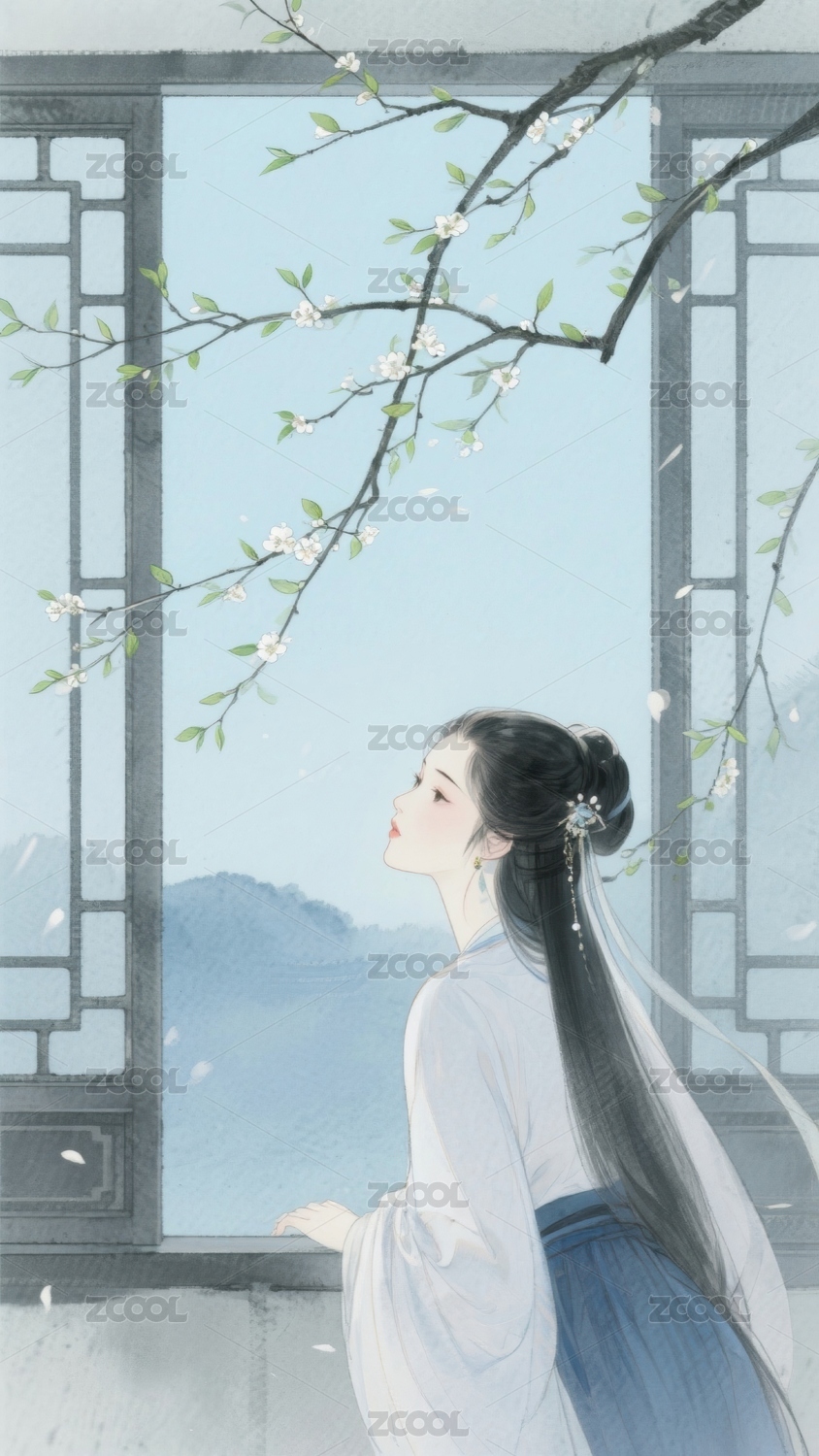 玉兰花盛开推开中式建筑窗户古风汉服女人