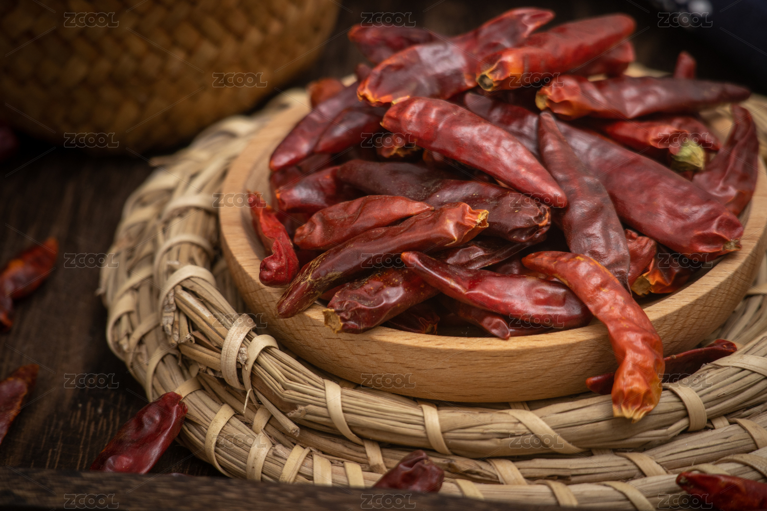 桌面盘子装满红色干辣椒调料香料静物