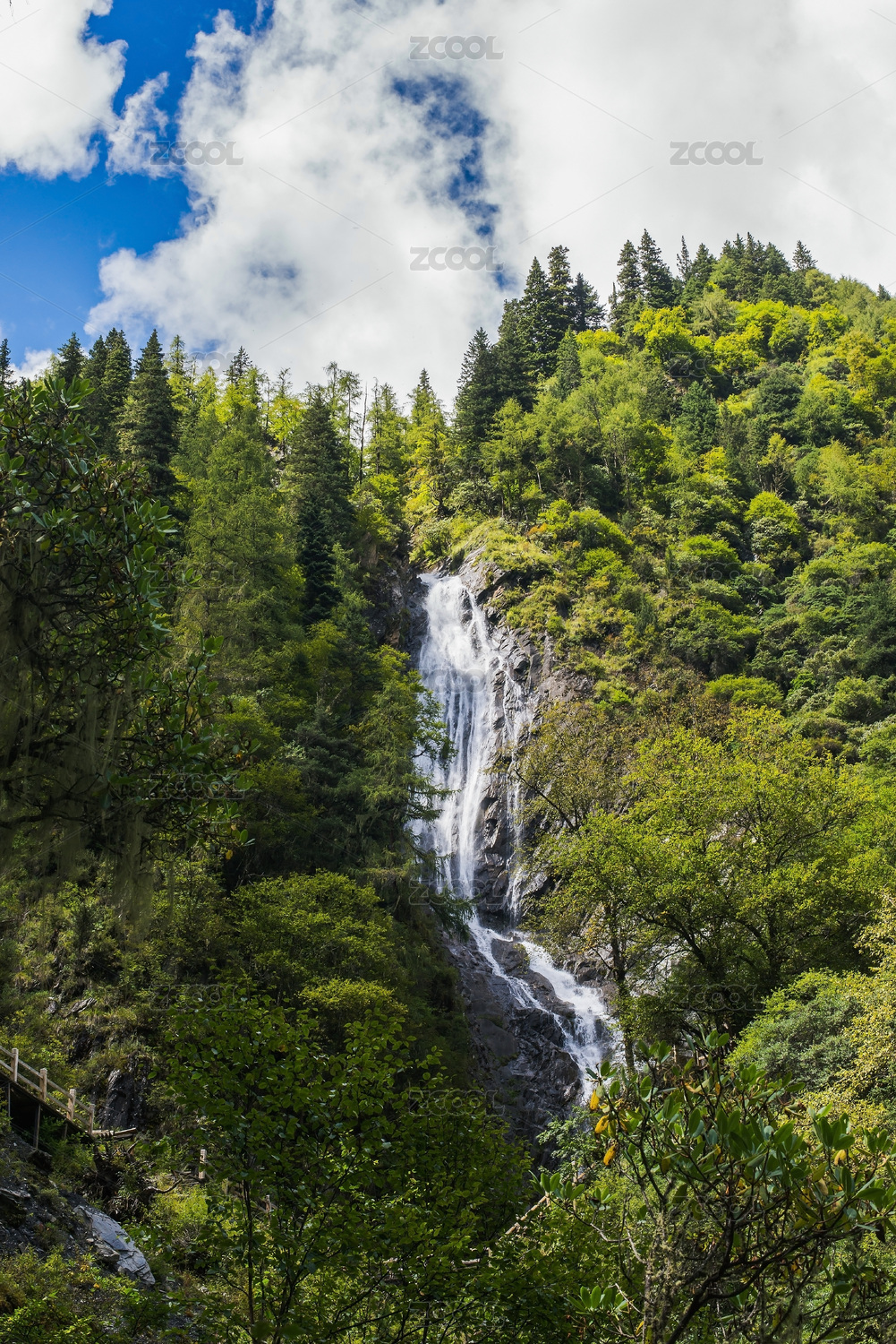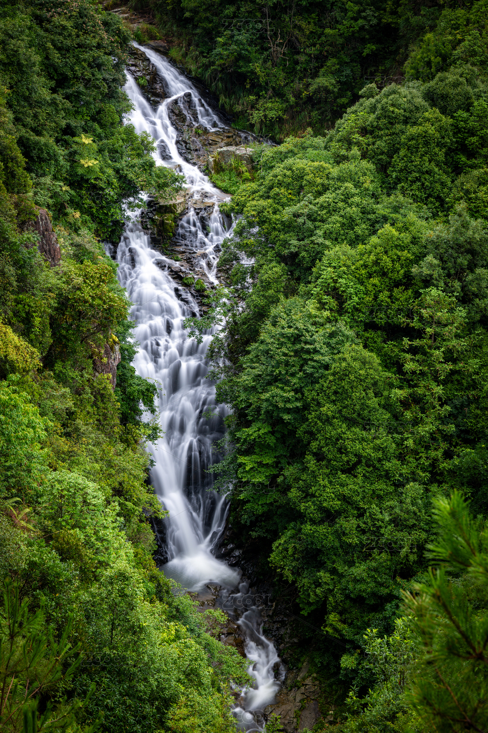掩映在山林中的一处两叠瀑布