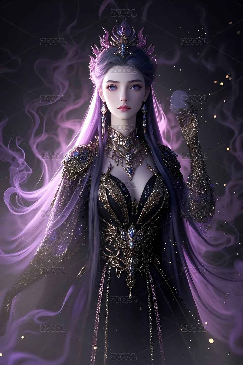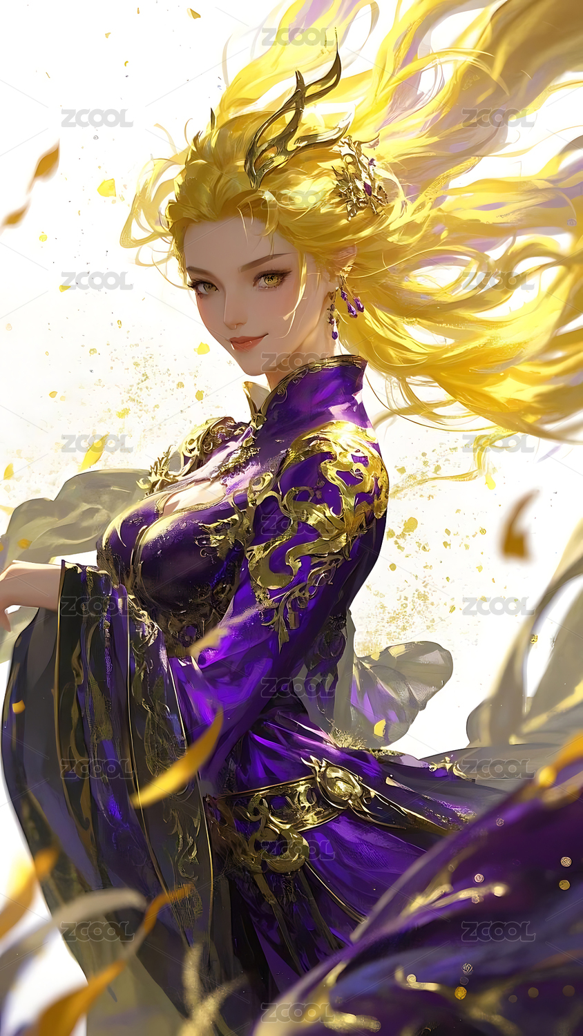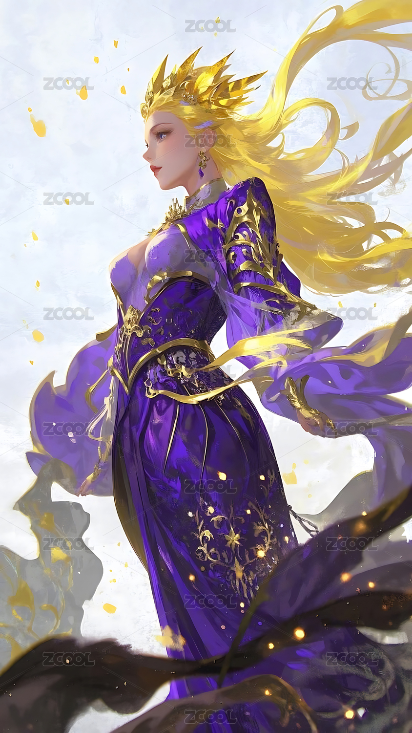 金发紫衣女王的侧影,配以华丽的金色装饰