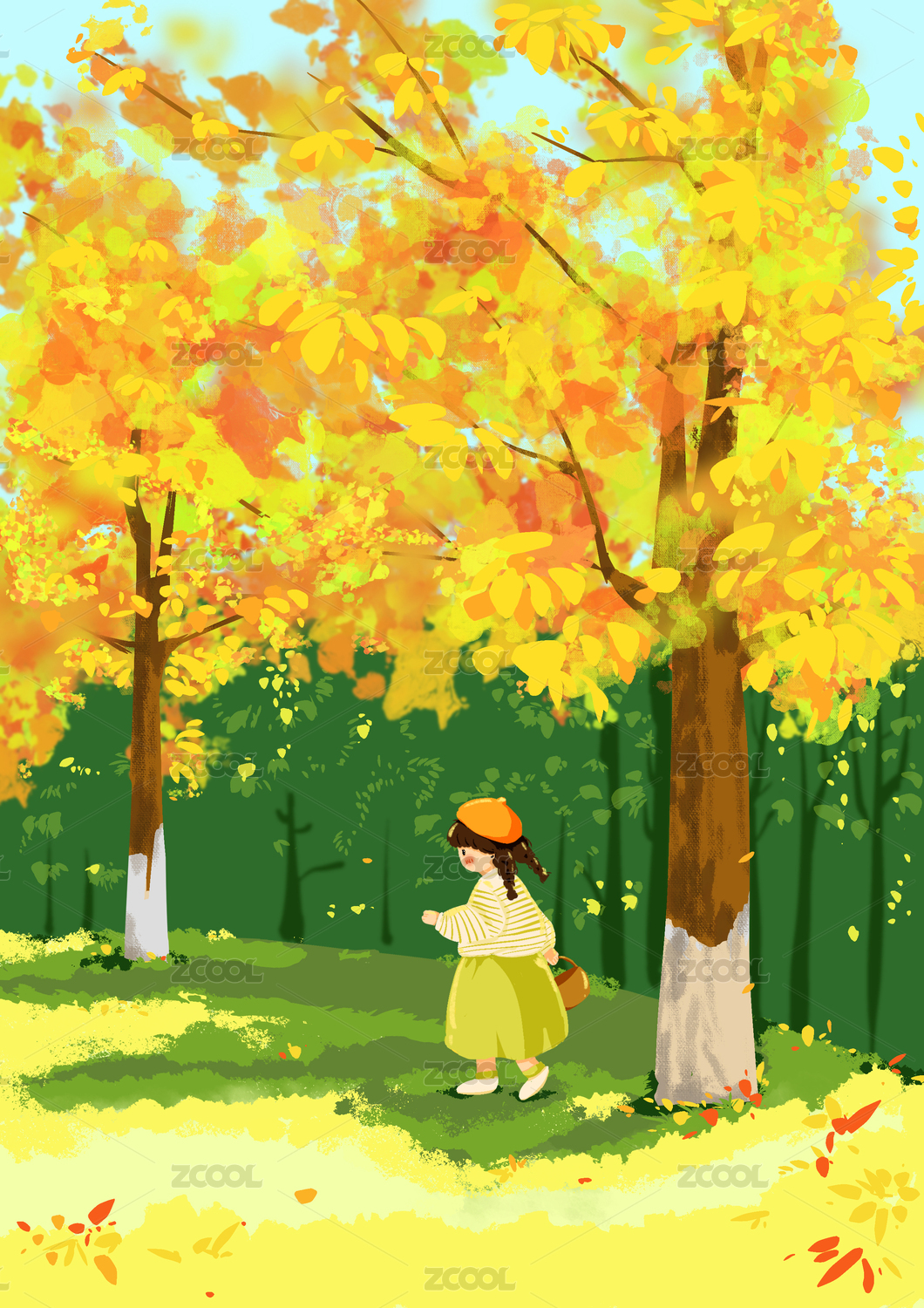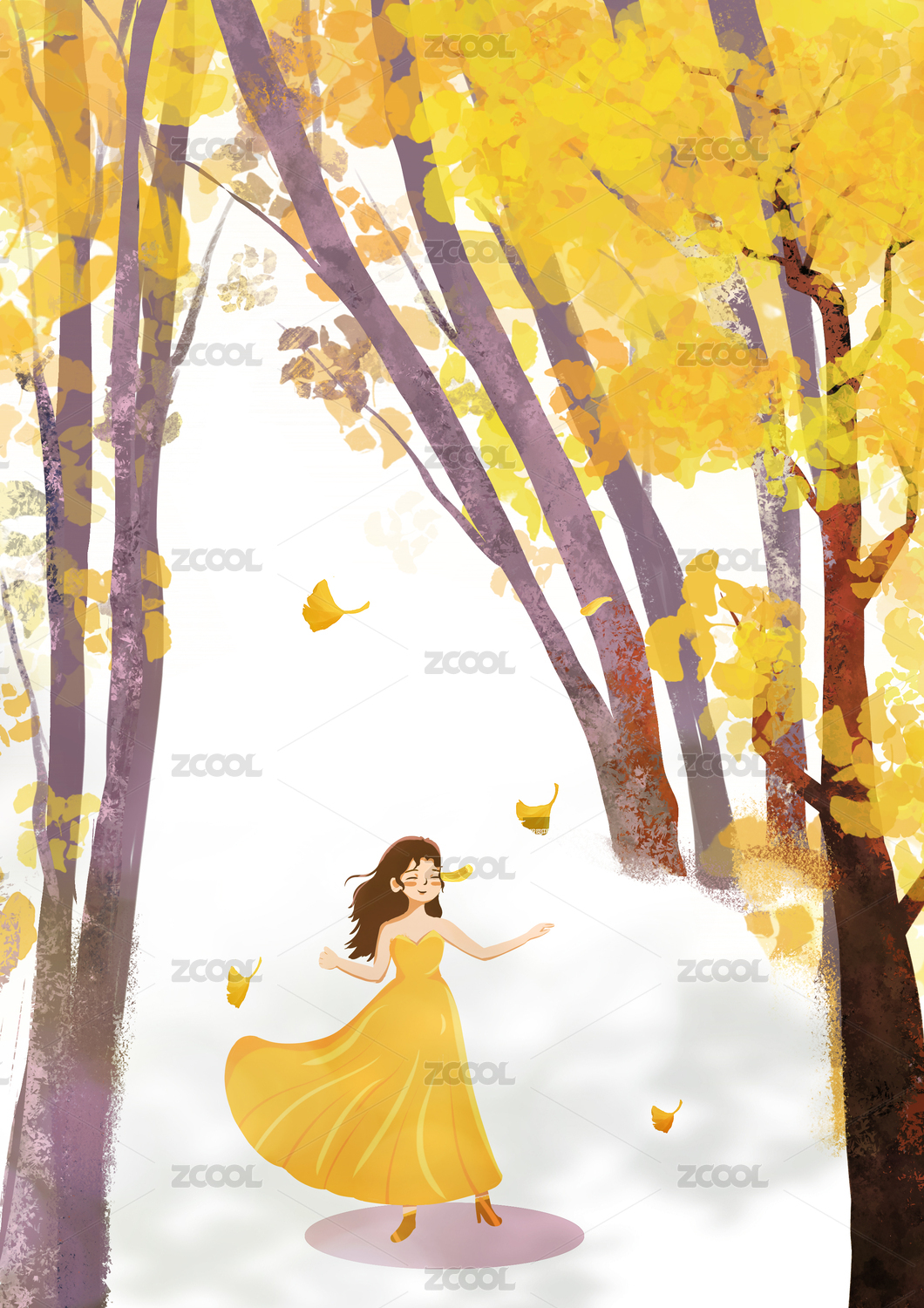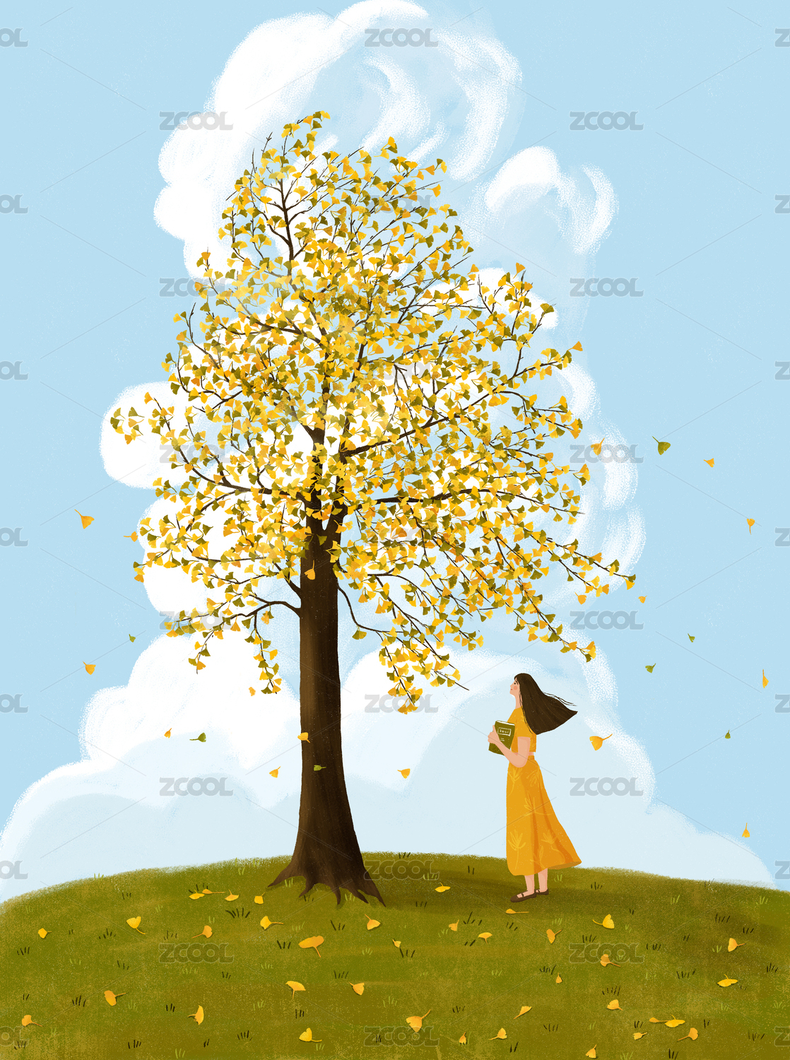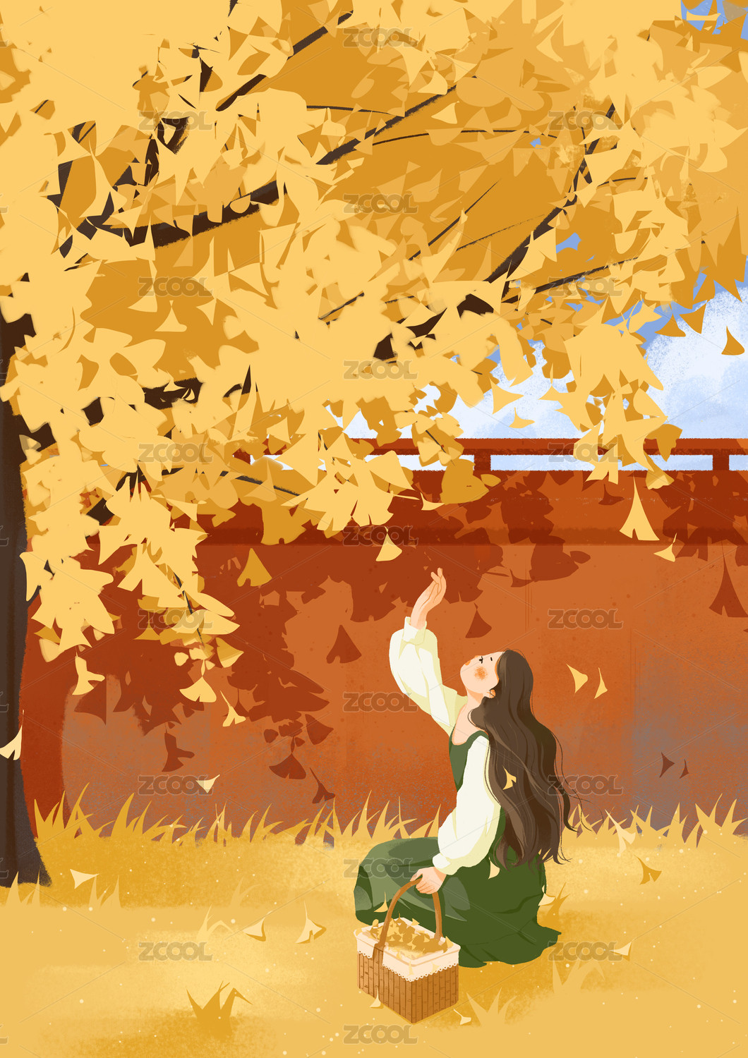 秋季银杏叶和唐朝女孩中国风古风水墨插画