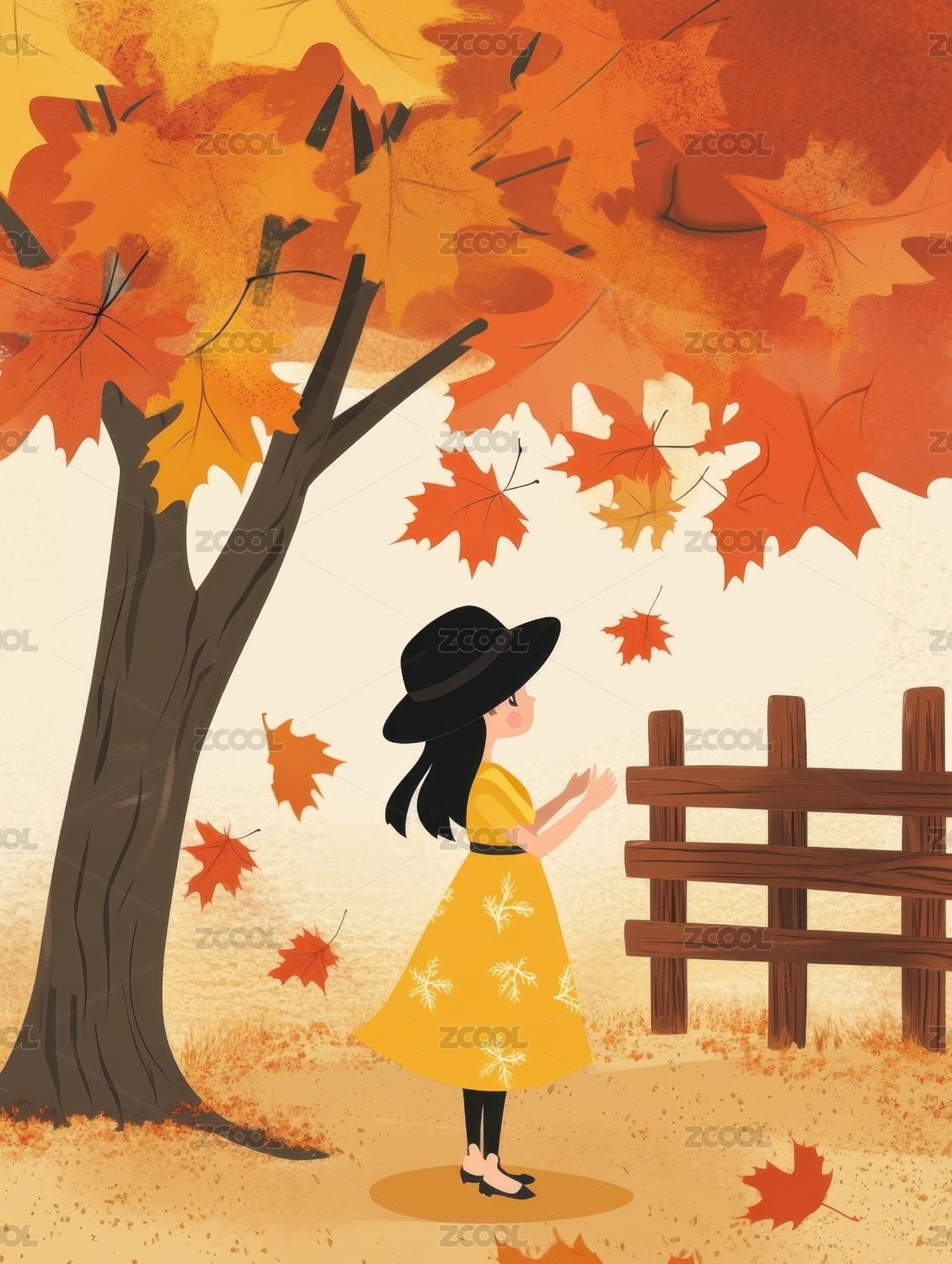 白底竖幅枫树下荡秋千的女孩秋分节气插画